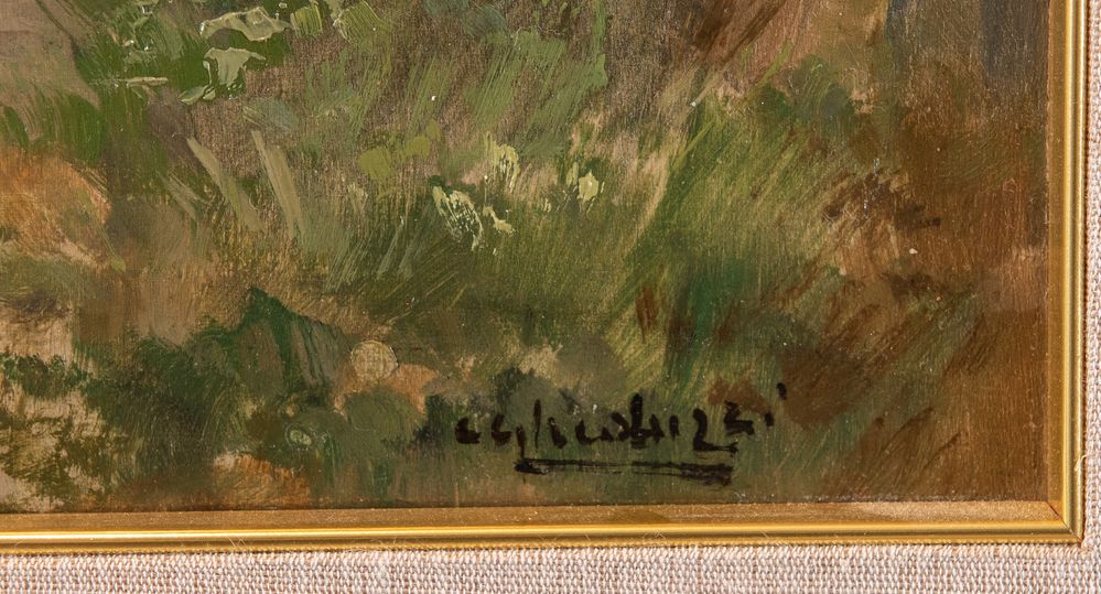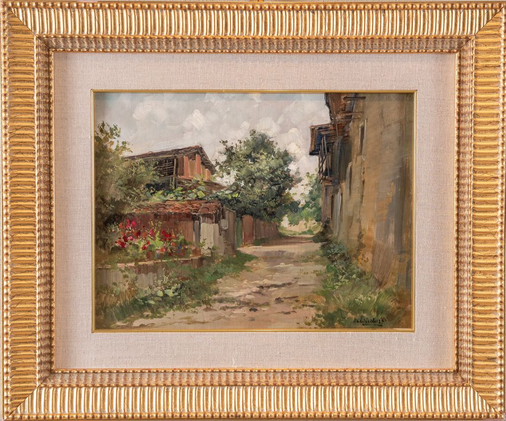 CESARE GHEDUZZI (Crespellano 1889 - Torino 1957) "Paesaggio". Olio su tavola. Cm 30,5x40,5. Opera firmata in basso a destra C. Gheduzzi.