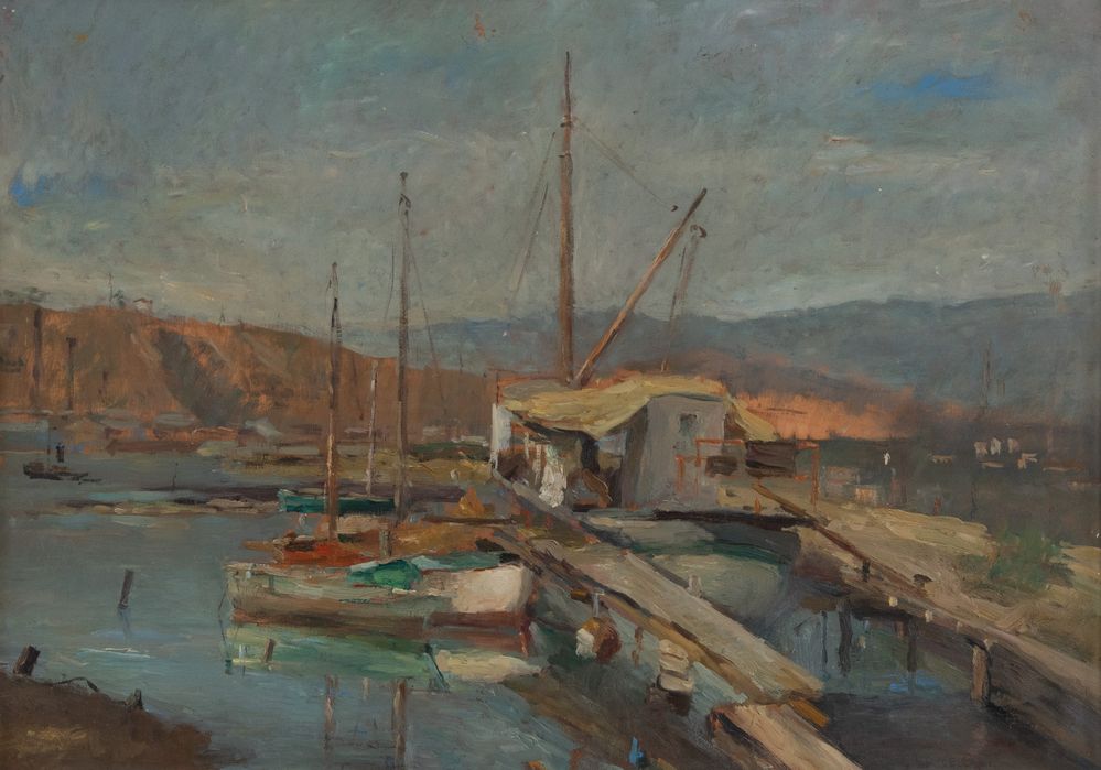 NORMA MASCELLANI (Bologna 1909 - 2009) "Marina". Anni '50 del XX secolo. Olio su tavola. Cm 42x60. Opera firmata in basso a destra Mascellani.