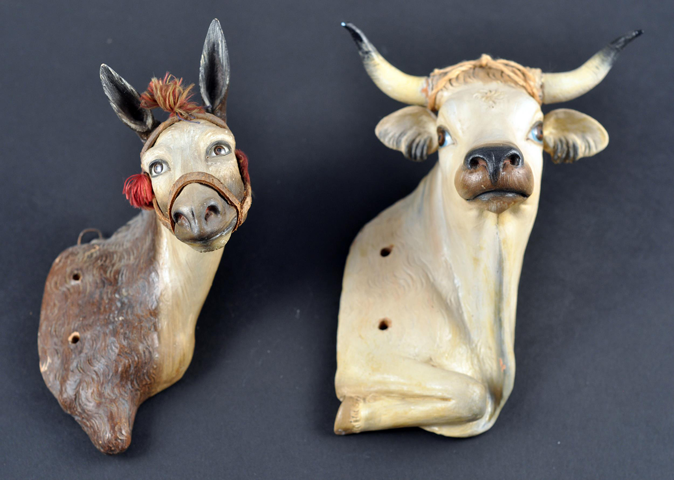 Mezzo busto di bue e asinello in terracotta dipinta in policromia cm 14x12 Napoli XVIII-XIX secolo