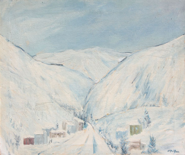 DEL BON Angelo (Milano 1898 - Desio 1952) Borgo sotto la neve, 1946 olio su tela, cm. 51 x 60 Autentica dell'Archivio Storico e Catalogo Generale Angelo Del Bon,con firma degli eredi Del Bon Firma 'A. Del Bon' (in basso a destra) #Firma, data, titolo 'A. Del Bon, 1946, Borgo sotto la neve'; #timbro Arte Villa, Milano (al retro)