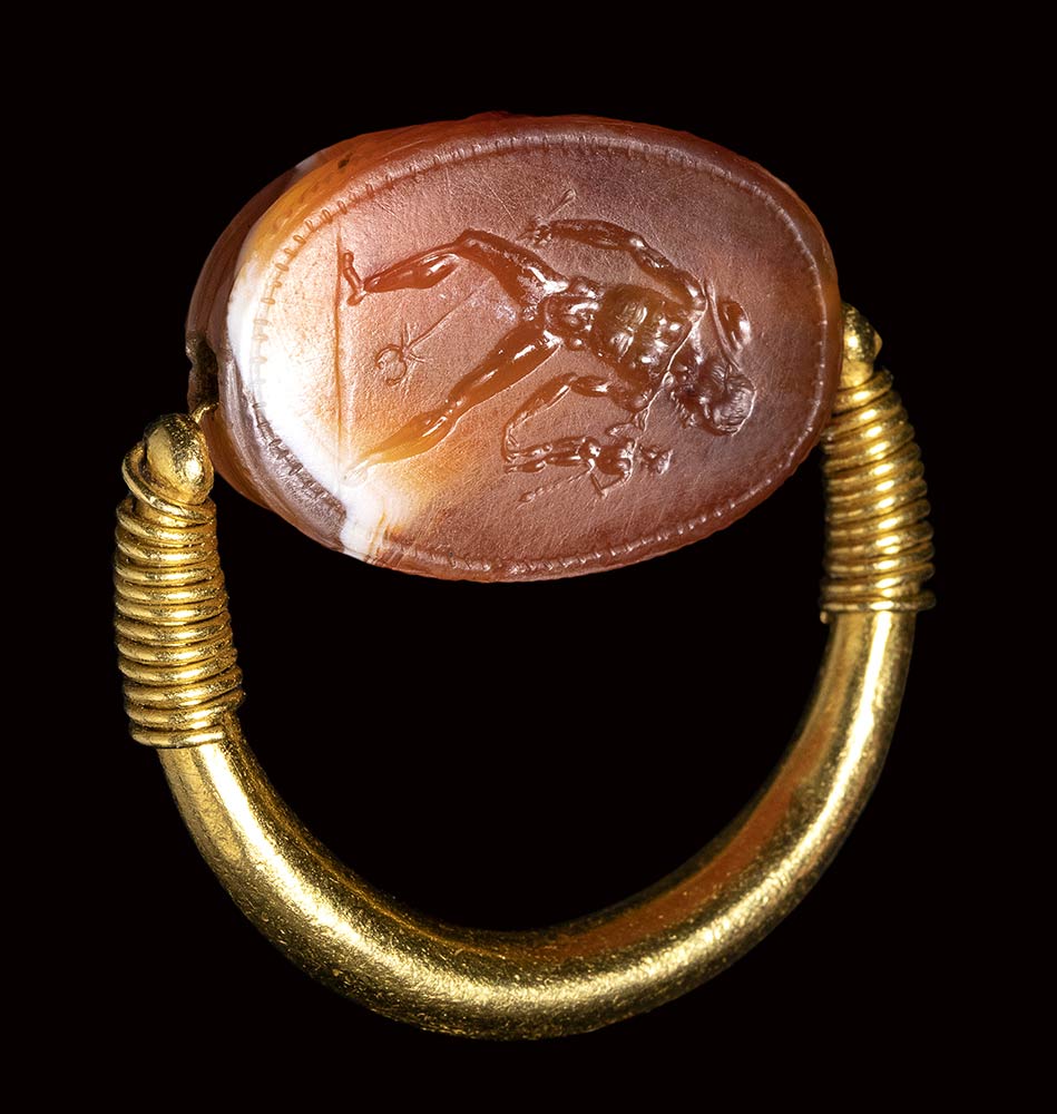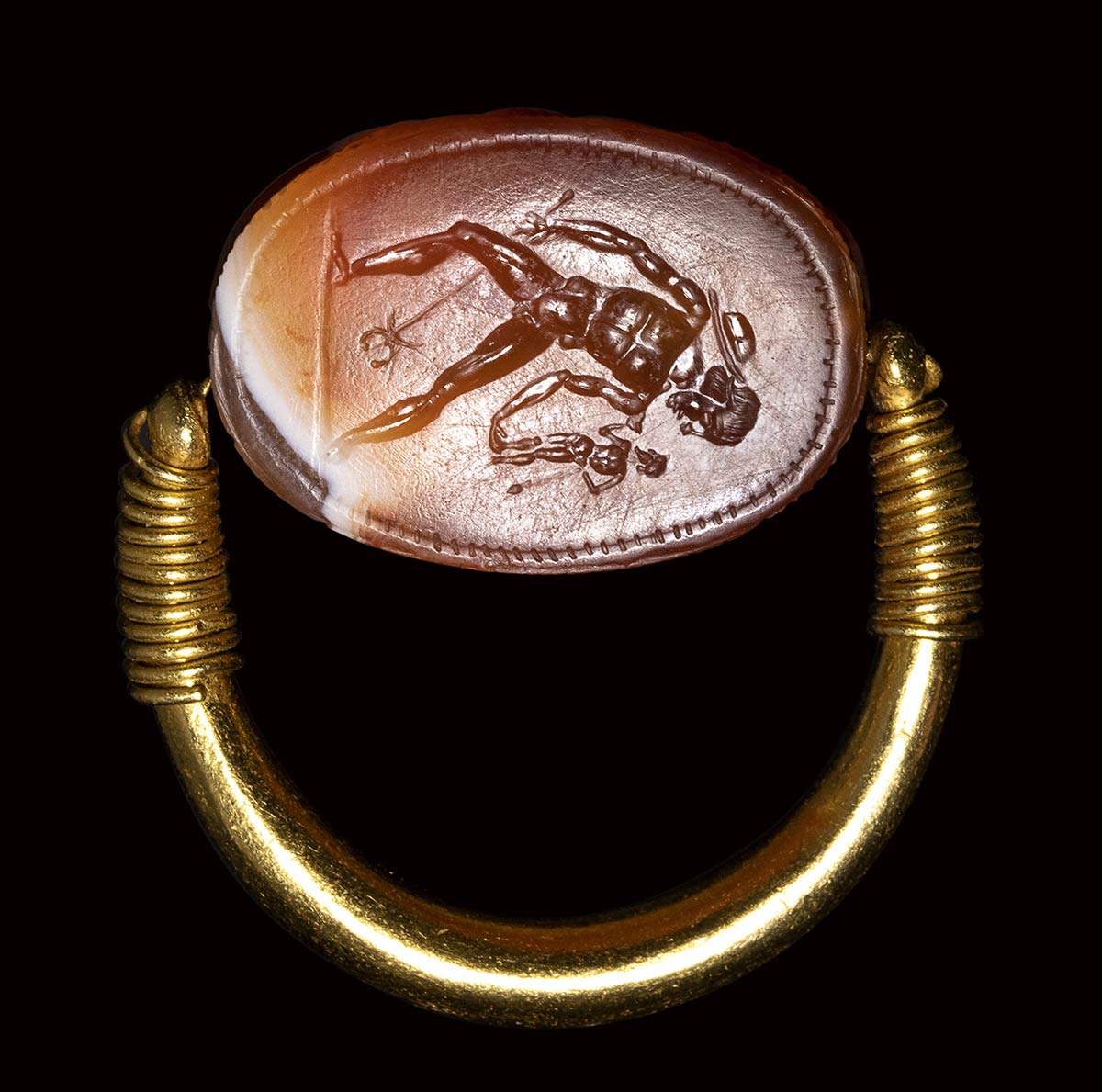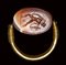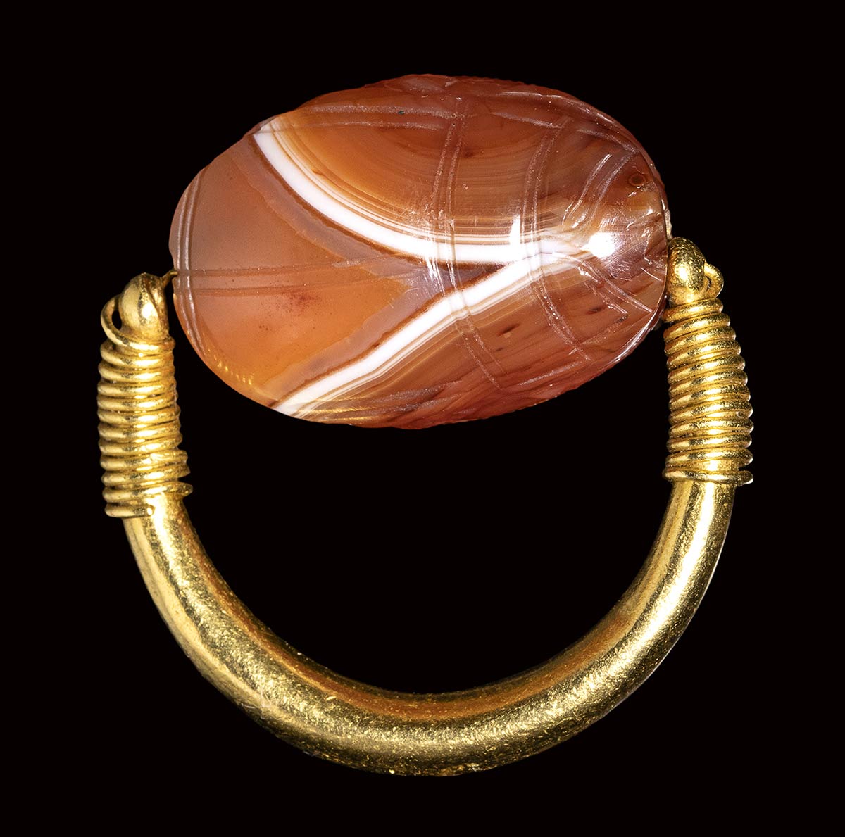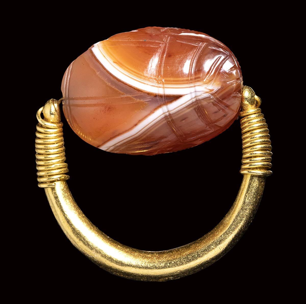 A fine etruscan banded agate scarab intaglio set in a swivel gold ring. Hermes Psychopomp.<br><br>4th century B.C.