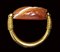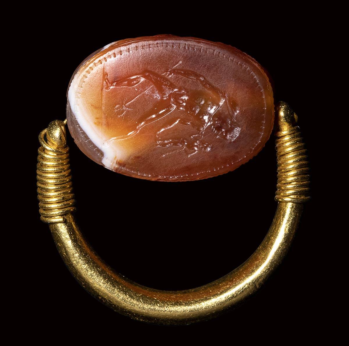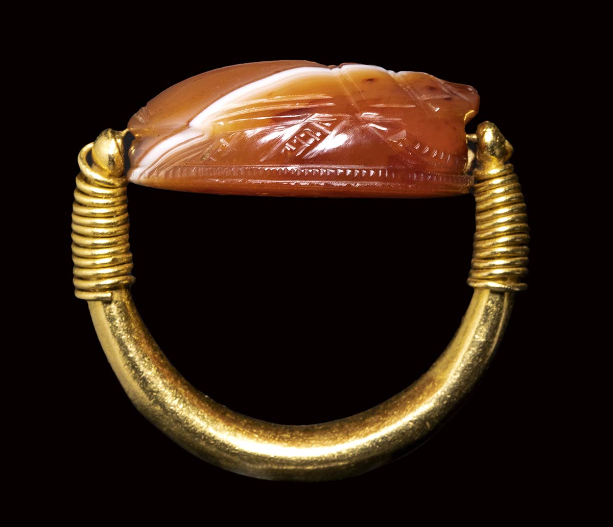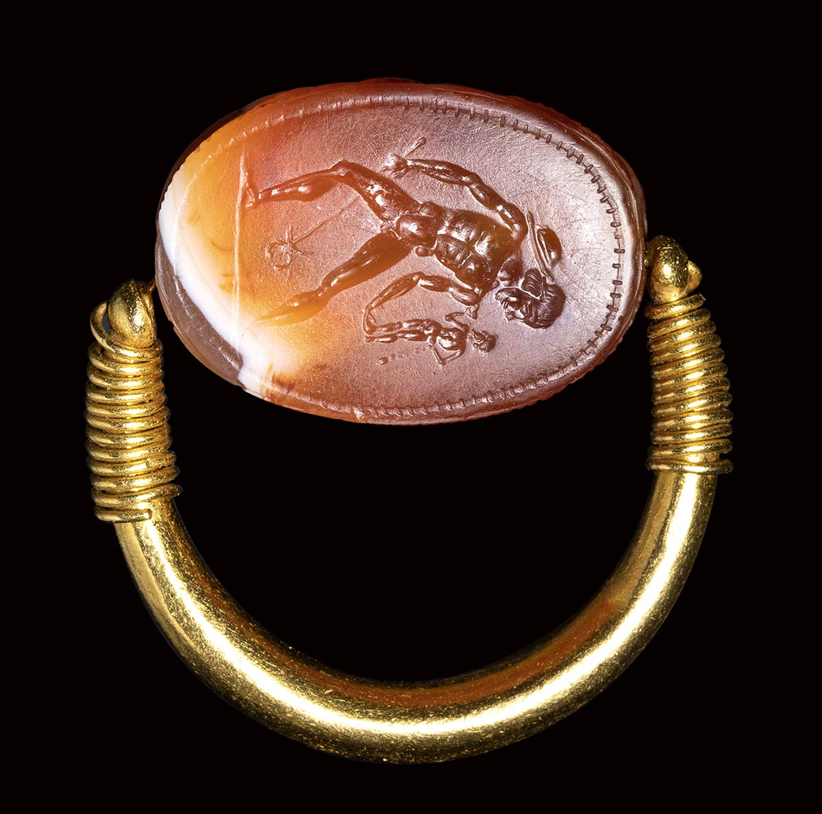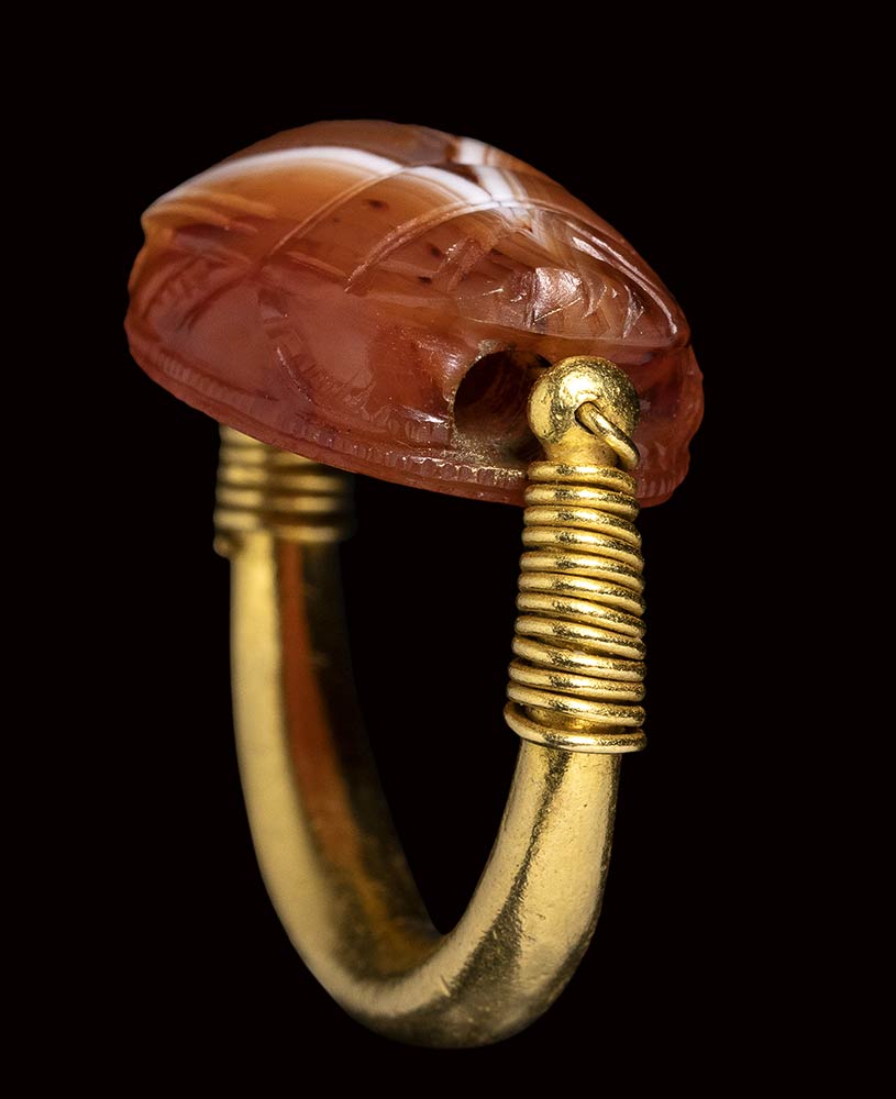 A fine etruscan banded agate scarab intaglio set in a swivel gold ring. Hermes Psychopomp.<br><br>4th century B.C.