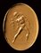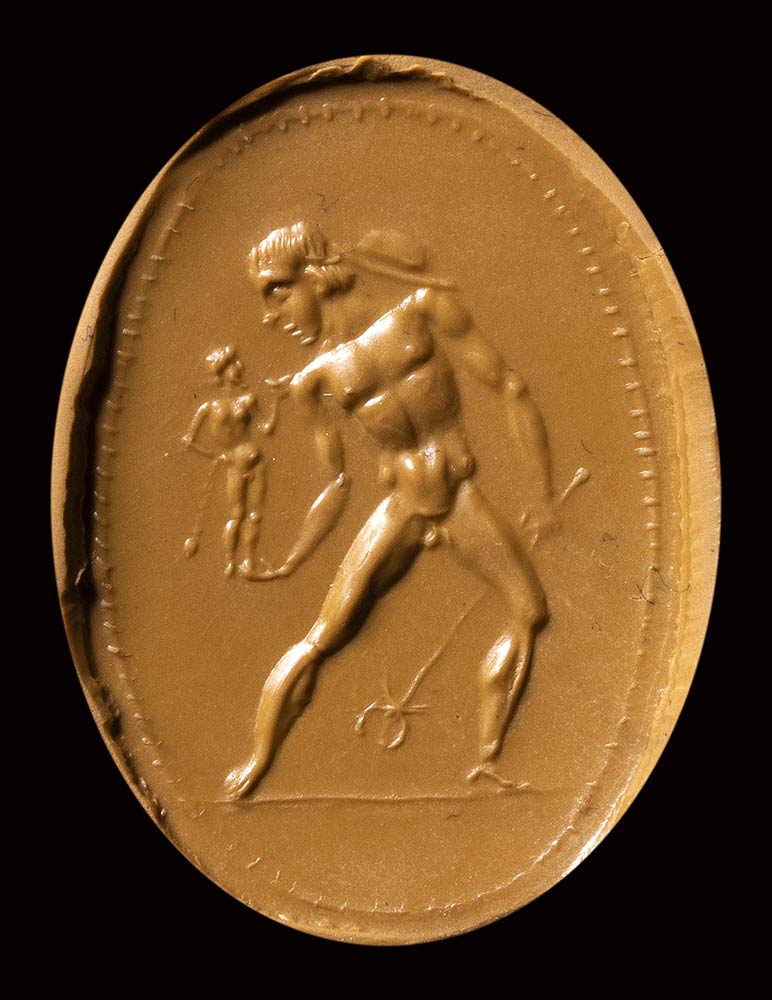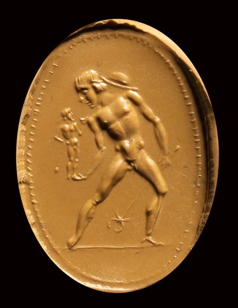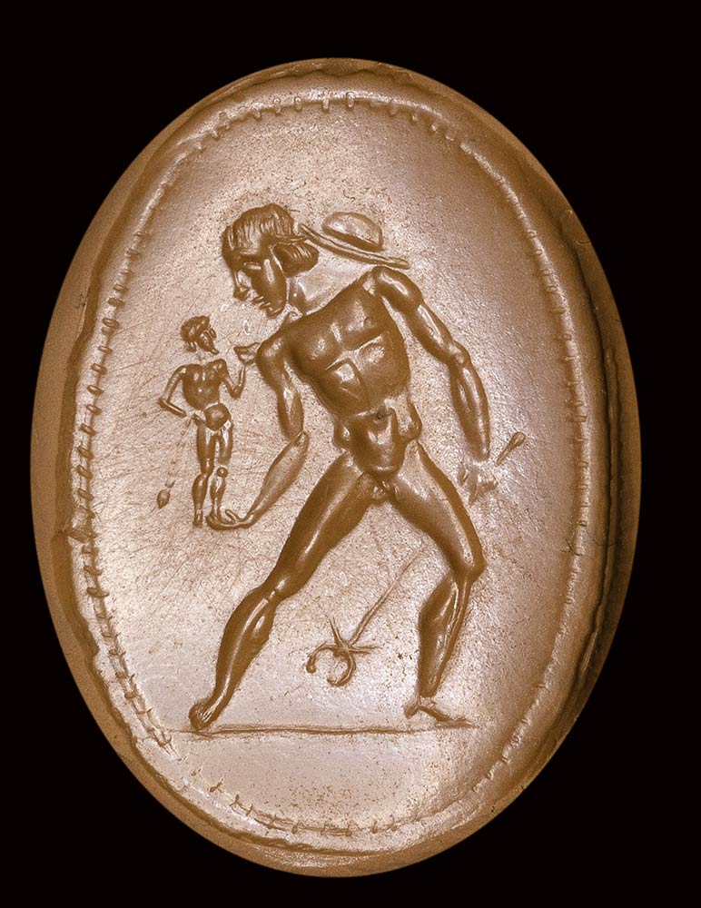 Hermes psychopomp moves to the left, but with the frontal torso and the head turned in profile backwards. The young god is naked and wears just the petasos resting on his shoulder and holds the kerikeion in his right hand; in his left hand he holds an idol depicting Hercules with a club (perhaps an allegory of souls towards the afterlife). Dotted frame. Groundline. This extraordinary representation is engraved on a scarab carved on an orange agate with equally extraordinary white stripes. On the back, in correspondence with the body of the insect, the two symmetrical white veins form an elegant V, perfectly centered. Signs of wear. Parallels: P. Zazoff, Etruskische skarabaen, 1968, n. 109. Cades, Gemme etrusche, 1b II 66. Furtwangler, AG. Taf. 16,54. AGDS, Band II, Staatliche Museen Preubischer Kulturbesitz Antikenabteilung, Berlin, taf. 50 n. 232. Cfr. Silver stater of Pheneus, Arcadia, 360-330 B.C.