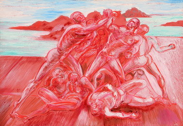 SASSU Aligi (Milano, 1912 - Pollença, 2000) Le isole di pietra, 1968 tempera su tela, cm. 48 x 68 Autentica dell'artista su fotografia, con timbro della Galleria d'Arte Carlina, Torino Firma 'Sassu' (in basso a destra) #Firma, data, titolo, firma 'Aligi Sassu, 1968, Le isole di pietra, Sassu'; #timbro della Galleria Ghelfi, Montecatini Terme (al retro)