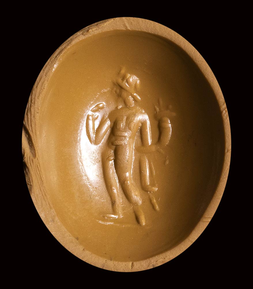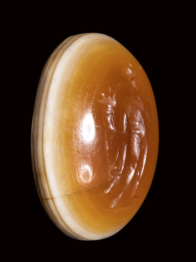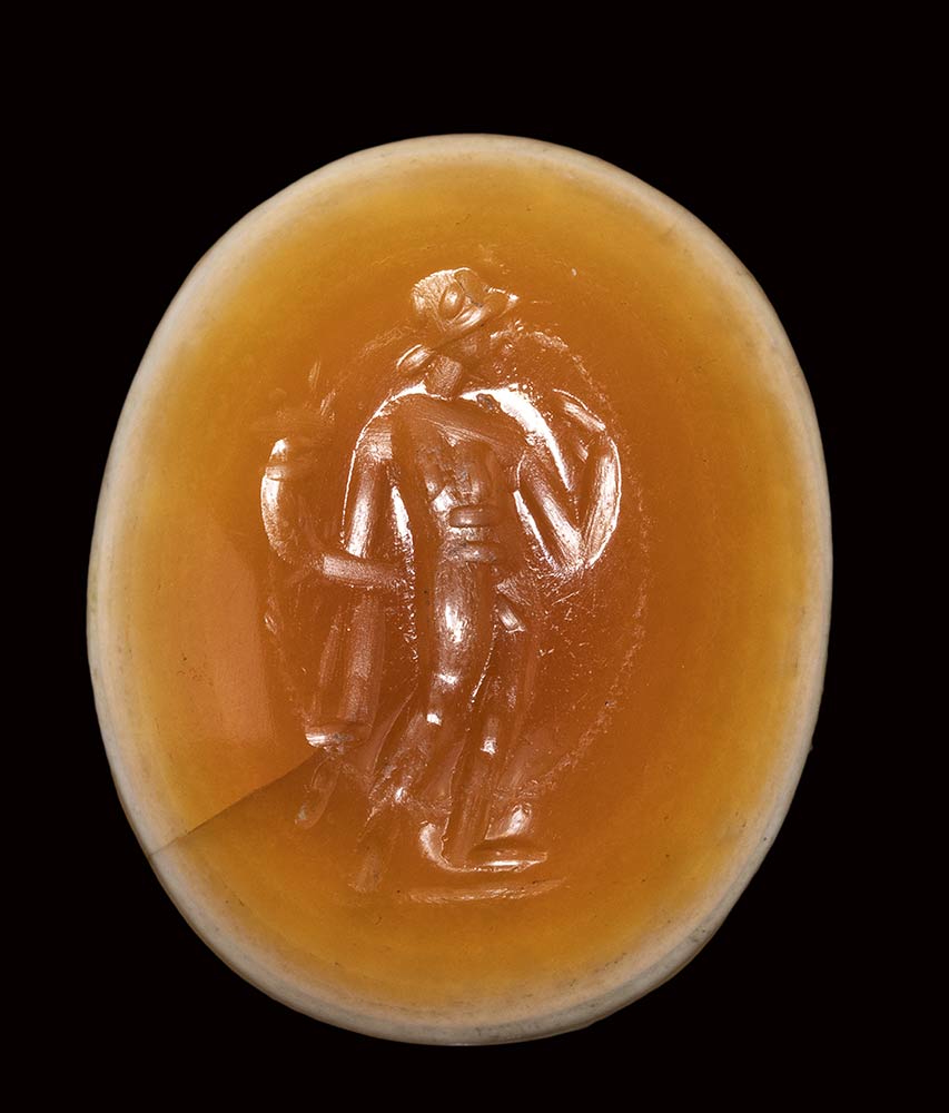 The figure is standing, to the right. With his right hand he holds the cornucopia, symbol of abundance; the left hand is raised towards the face, in its typical gestures. The effigy, of magical and protective power, is engraved on a large, slightly cabochon two-layered honey agate on a white background. Slight crack at the bottom left.