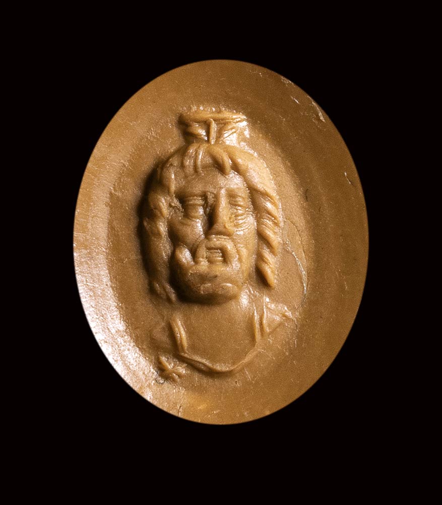 Bust of Jupiter Serapis almost frontal, with the modius on the head and the draped shoulders, deep engraved. Slightly burnt stone. Beautiful execution, inspired by greek models. Slight wear marks.