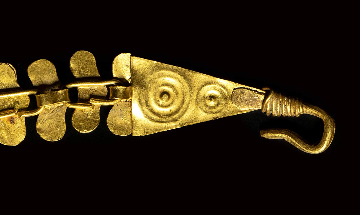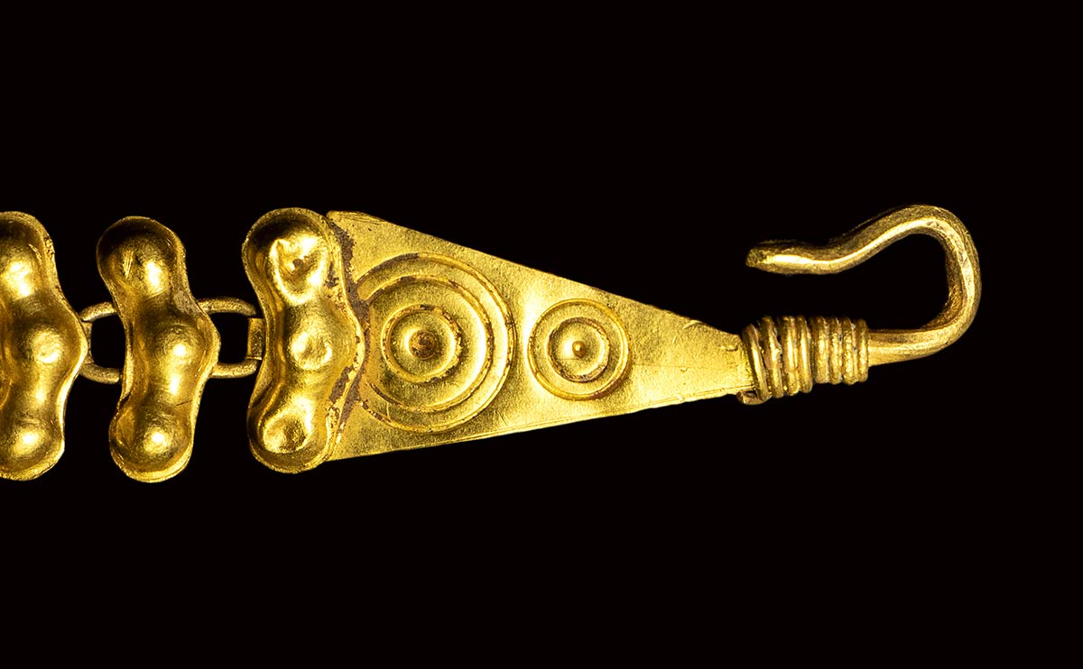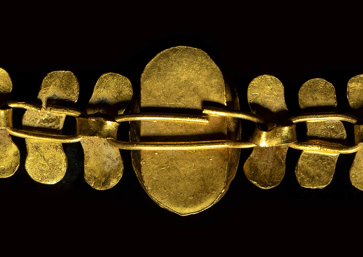 Shepherd with petasus, club and a goat. The specimen has an authenticity certificate (St James Ancient Art- C.J Martin director): “extremely fine and delicate Roman golden necklace consists of thirty (fifteen in each side of the intaglio) hollow, double-leaf-shaped sections. Each section is made from golden sheet, and the sections are joined by links and loops on the back. The shape of the sections has evolved from double leaf and double bird shaped links in Roman jewelery into a more schematic shape as observed on this piece. The end of the chain has a triangular terminal with a hook for fastening, decorated with incised concentric circles. With a golden loop on the other side, it forms a clasp. In the center there is a golden setting with an inlaid oval carnelian intaglio depicting a shepherd wearing a hat and holding a staff. There is a small goat to his left side”. Very fine, intact, minor encrustations on the surface. Slight indentations to golden sections and minor scratches to the gem stone. Intaglio could be earlier for its early roman Italic stylistic influence.
