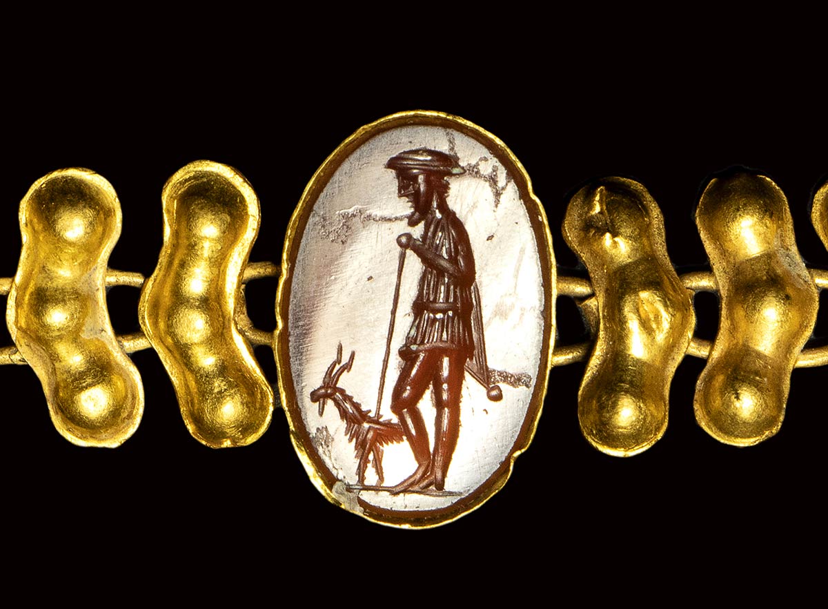 A fine roman gold bracelet with a sard intaglio. Shepard with a goat. 2nd - 3rd century A.D.