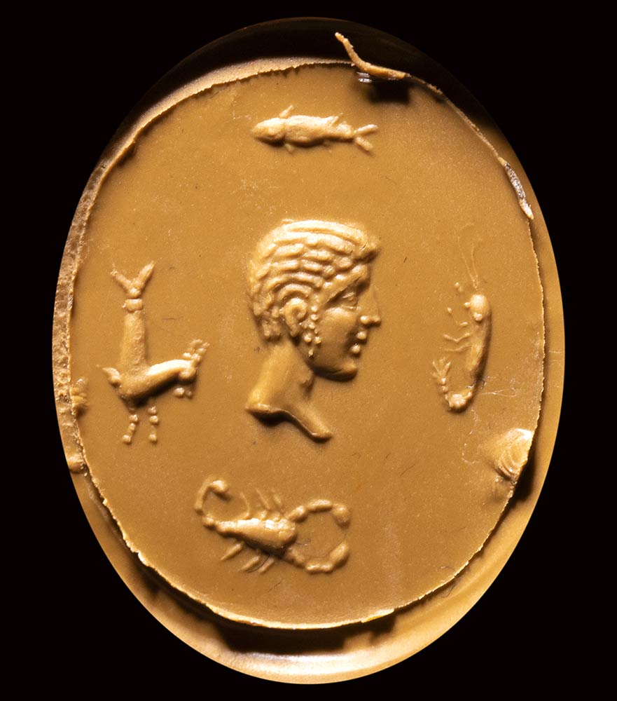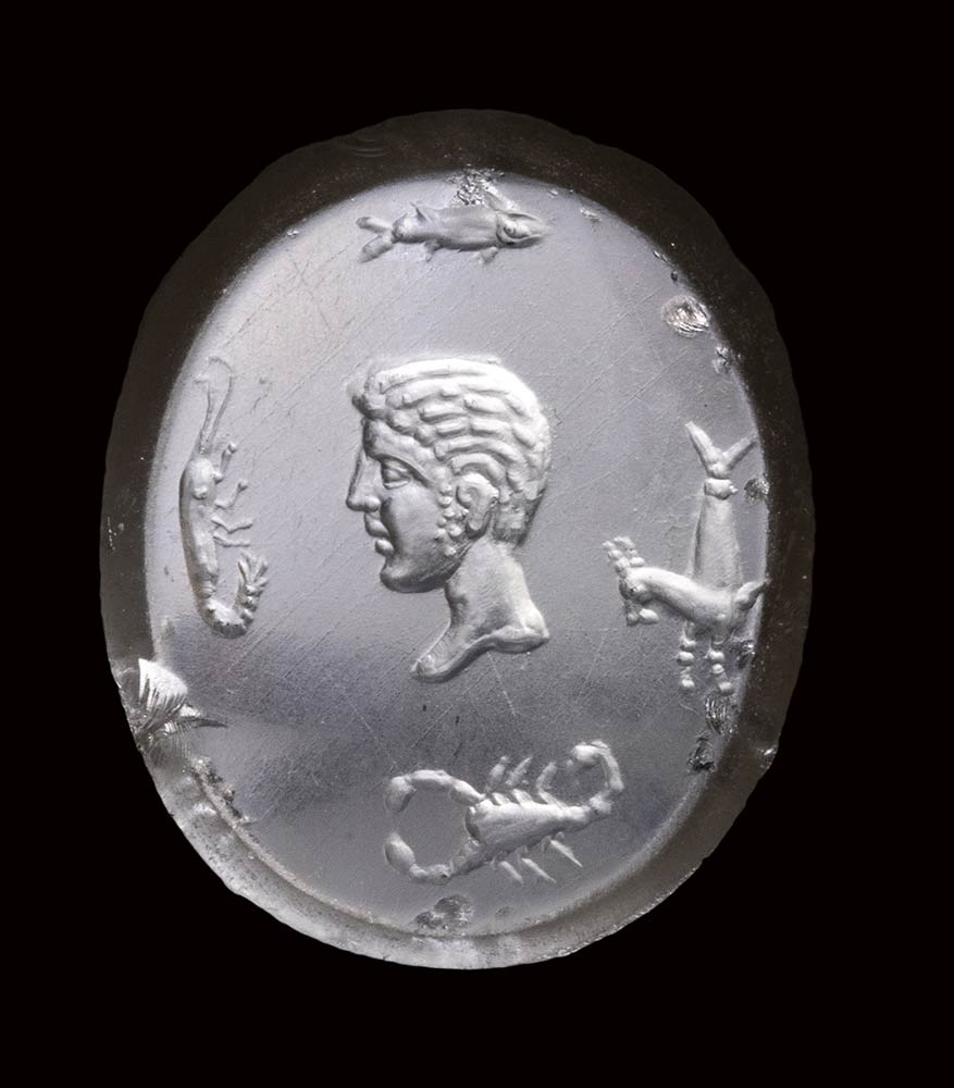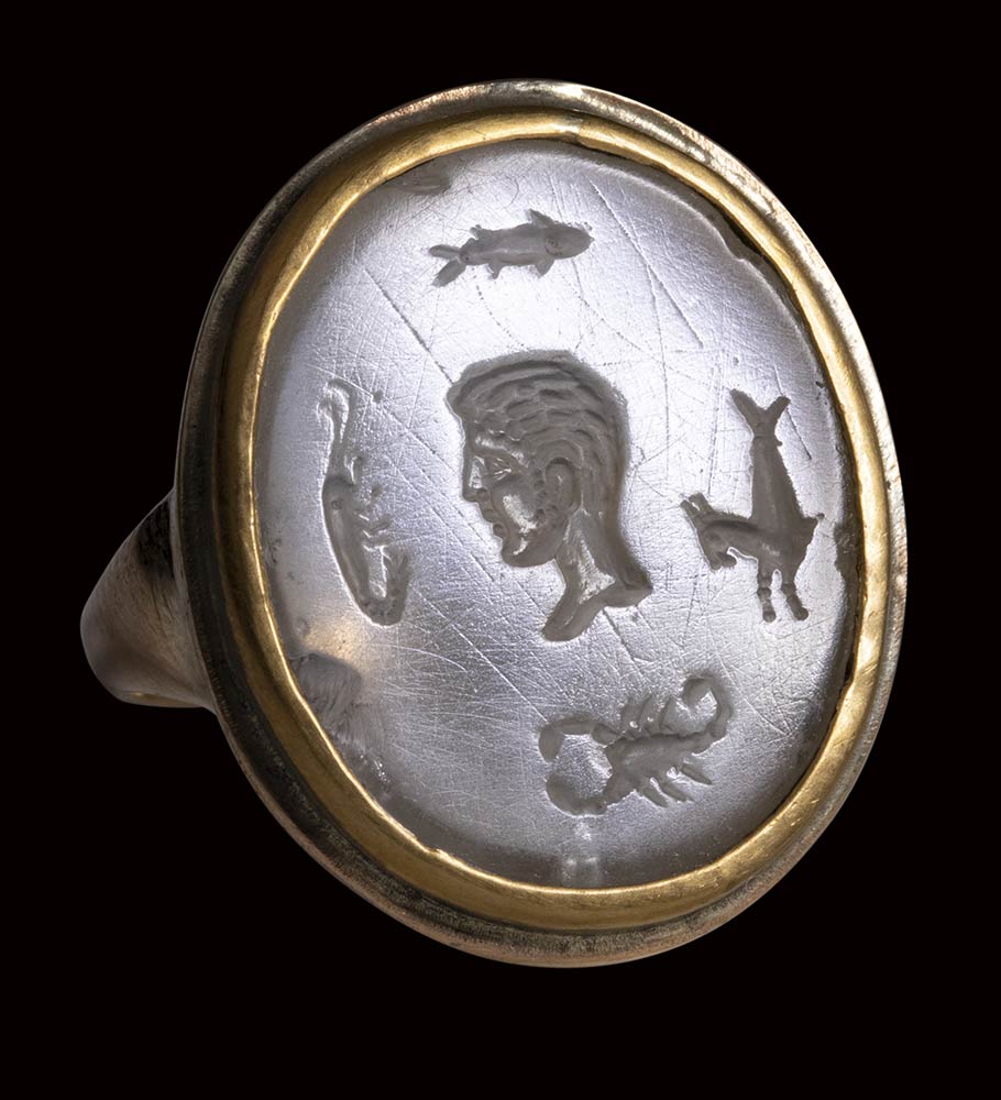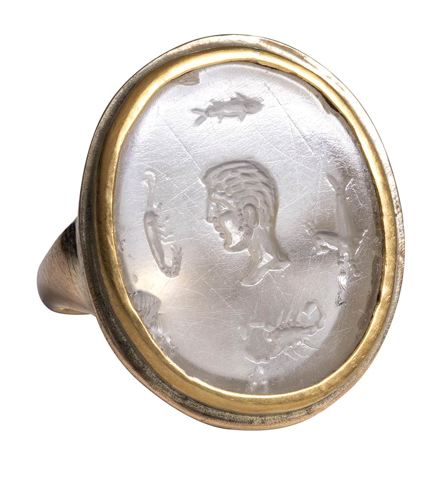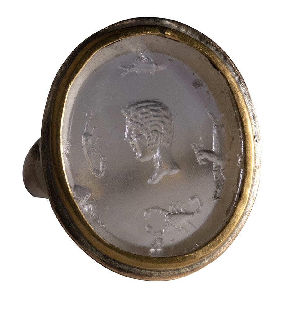 A large roman rock crystal astrological intaglio set in a gold ring. Portrait of youth with zodiacal and sea animals. Early 1st century A.D.
