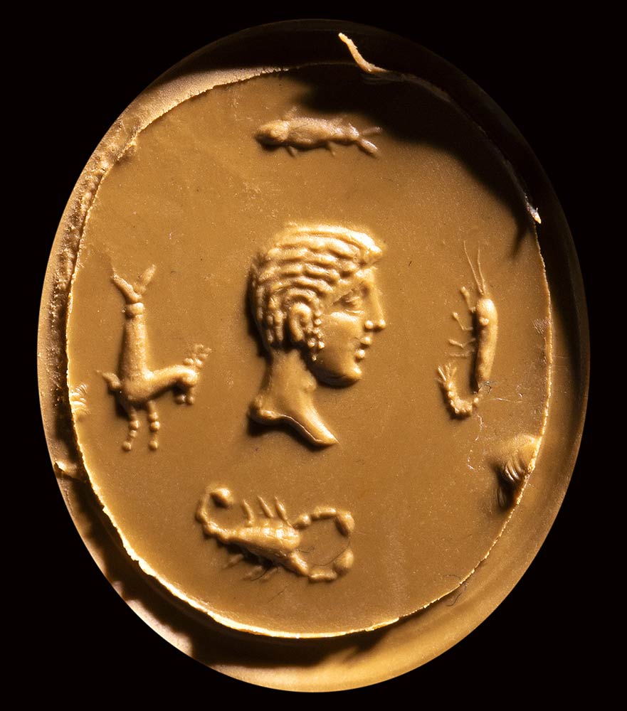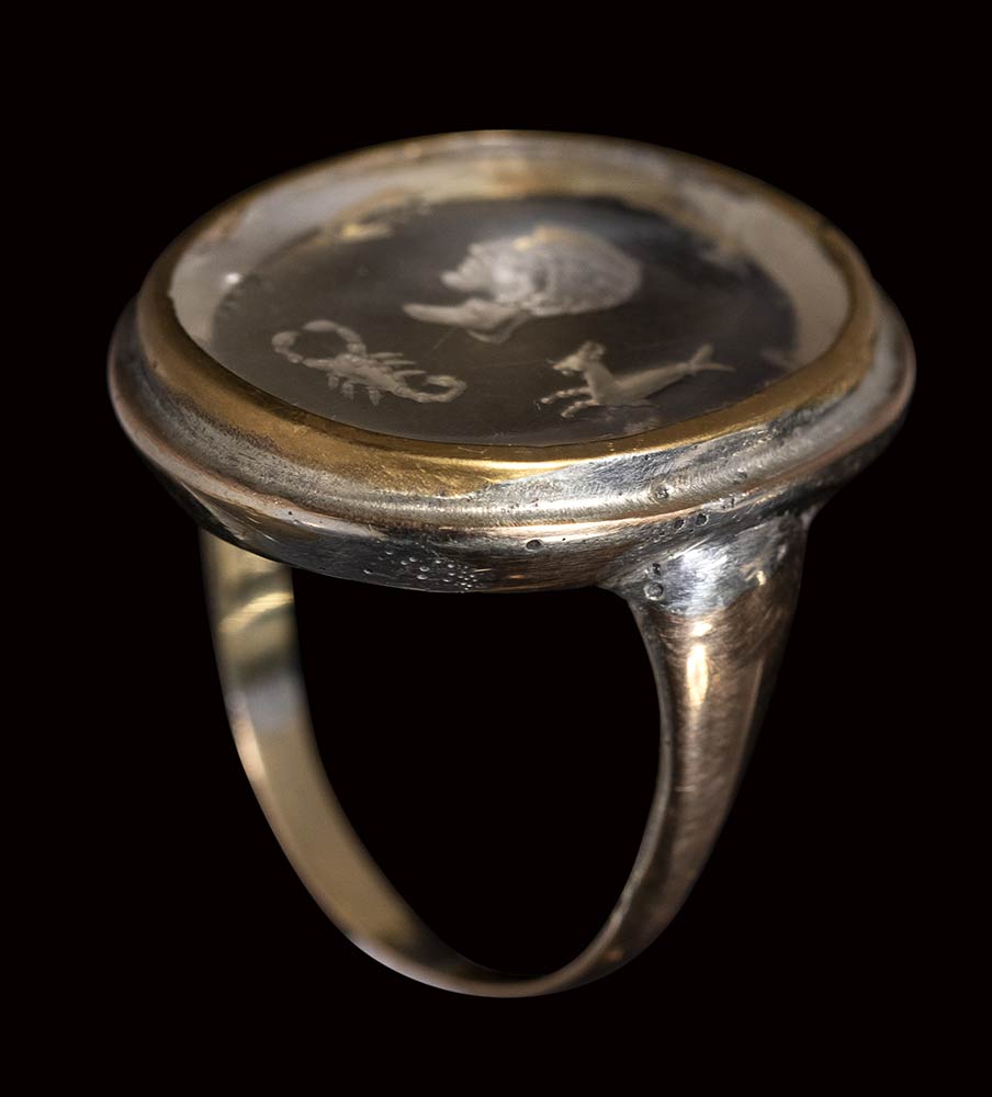 Juvenile head in profile facing left. The hair is short, a slight barbula goes down near the ear. The profile is linear, of the Octavian Augustus type. Around the portrait, there are four animals: a fish, a seagoat, a scorpion and a shrimp. These strongly symbolic animals can have, except for the shrimp, an astrological and allegorical meaning, especially the sea capricorn. Some details are engraved with small globular elements. The style is attributable to the end of the Republican age and the beginning of the Augustan period. Interesting allegorical composition. The work is engraved on a large rock crystal. Signs of wear and some light scratches on the surface. Small chips on the edge. The bezel edge is in high carat gold. Parallels: M.L. Volleinweider, Camées et intailles. Les Portraits romains du Cabinet des Médailles, pl. 46. ; M.L. Volleinweider, Die portratgemmen der Romischen Republik, pl. 142 n. 1, 2, 4, 6, ss; pl. 143, 144, ss; 149 n. 15; pl. 151 n. 16 ss. See the coinage. For the subject, a very close intaglio in AGKM (Kunst Museum, Wien) n. 520.