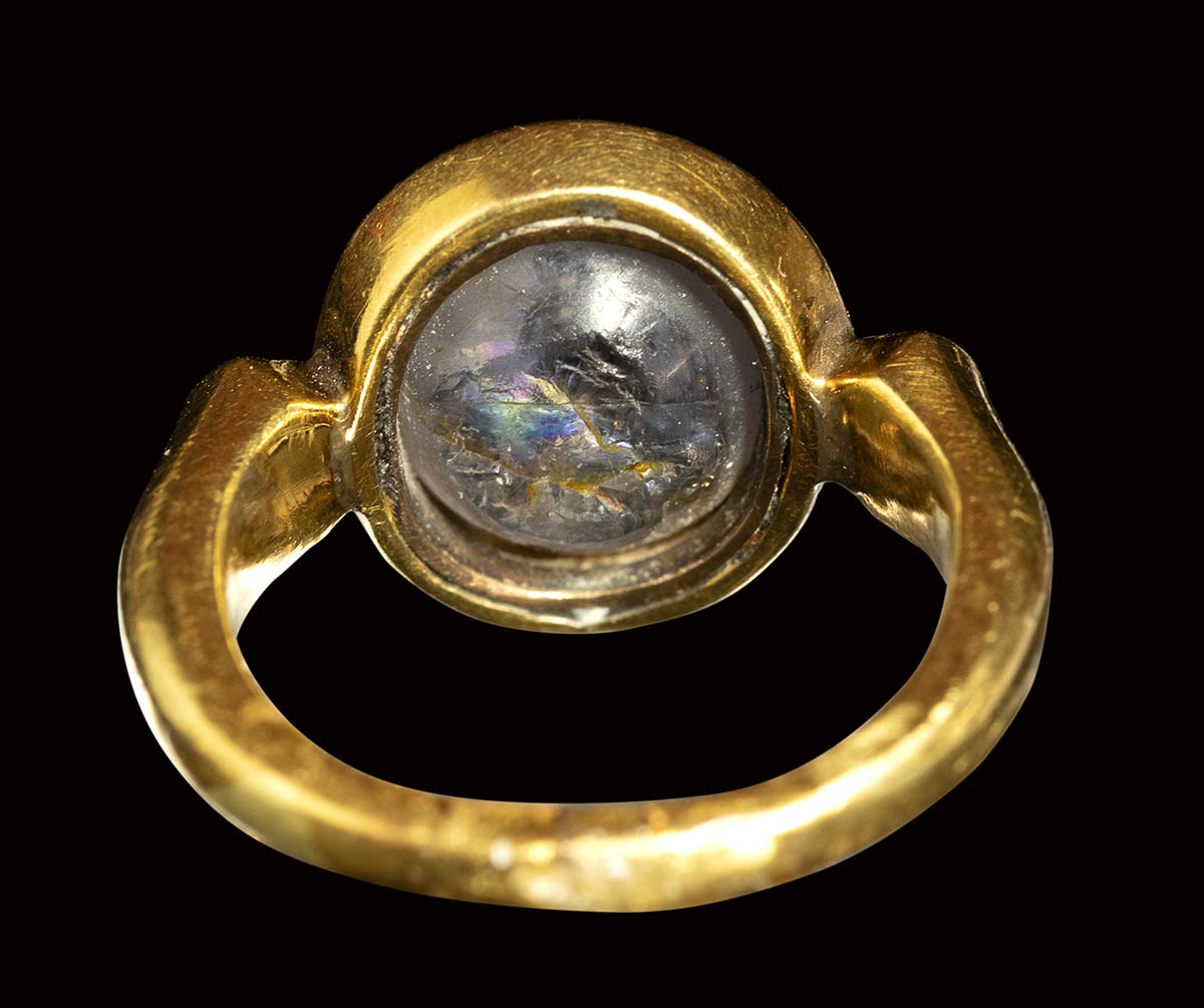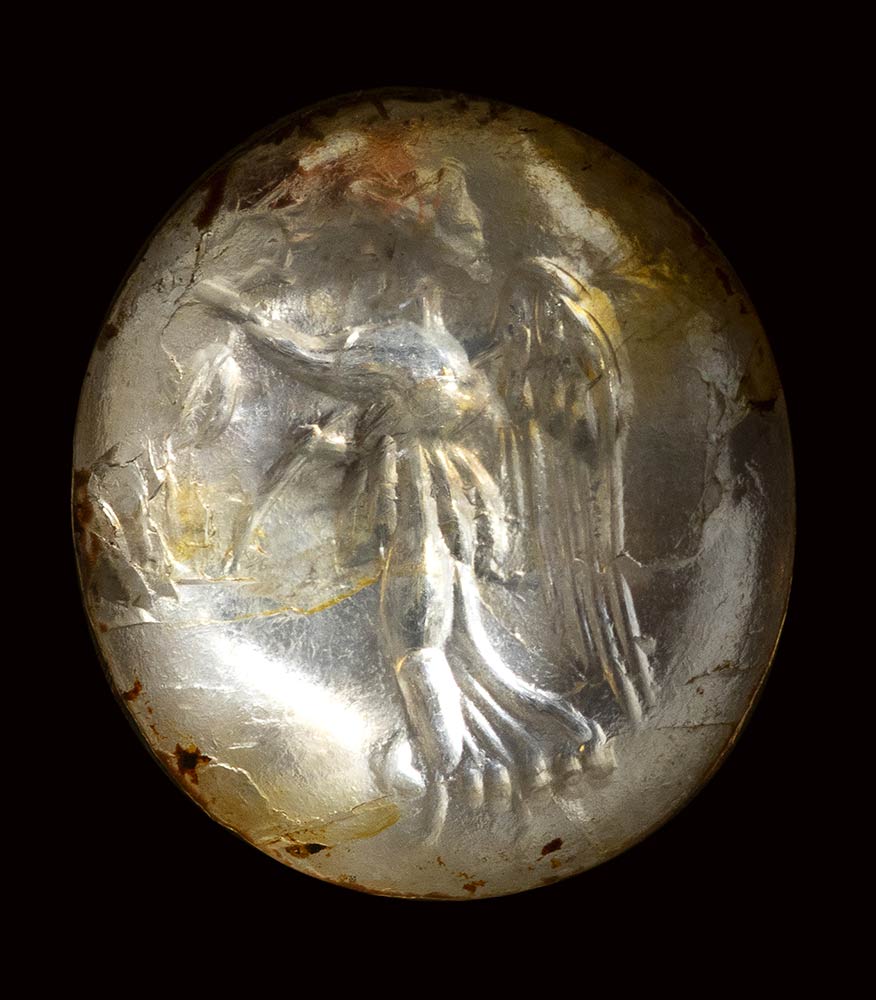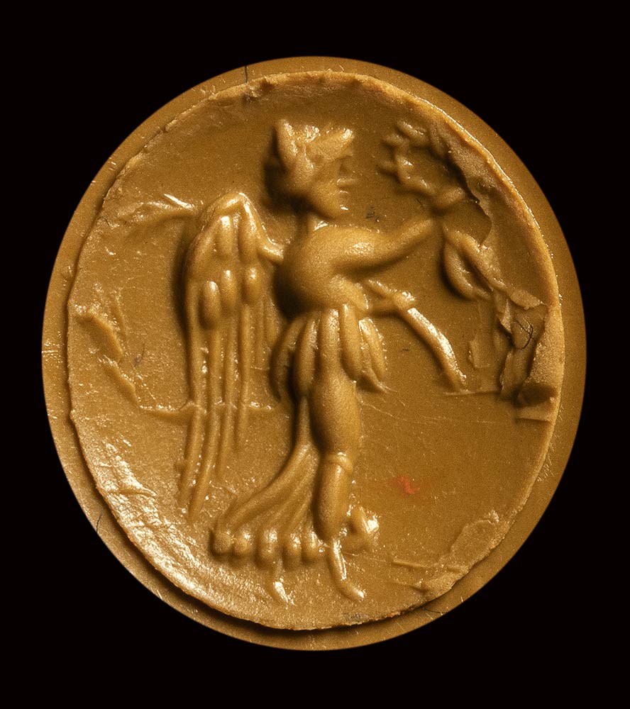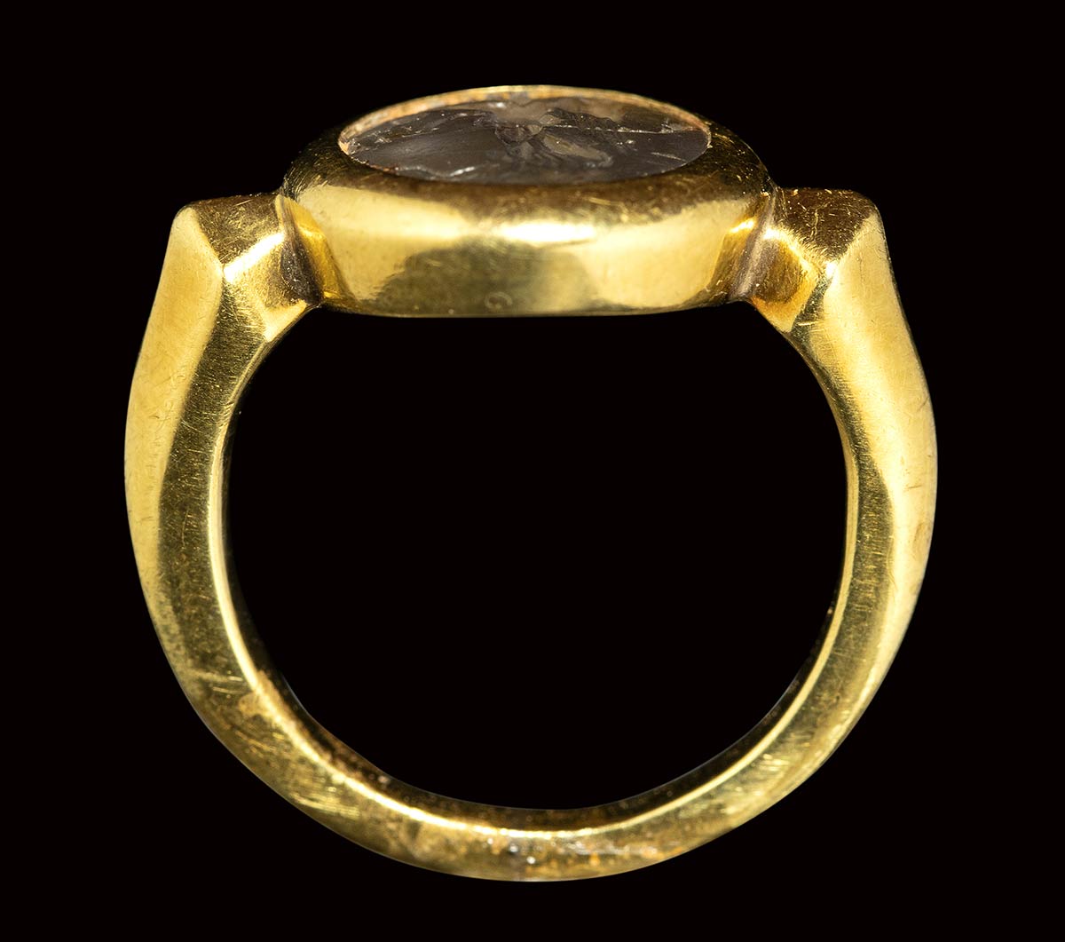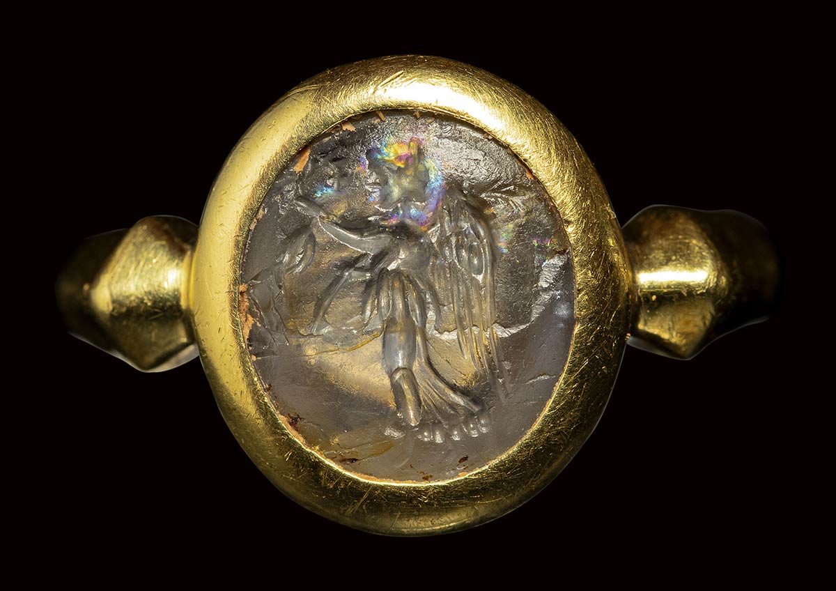 The intaglio depicts a winged Nike standing and turned left. She holds a palm branch and a laurel wreath in her hands. Slight chips and wear marks on the surface of the stone. The later massive gold mounting with elliptical hoop, flatten within is extending with sided shoulders narrowed toward the junction with the rounded bezel.
