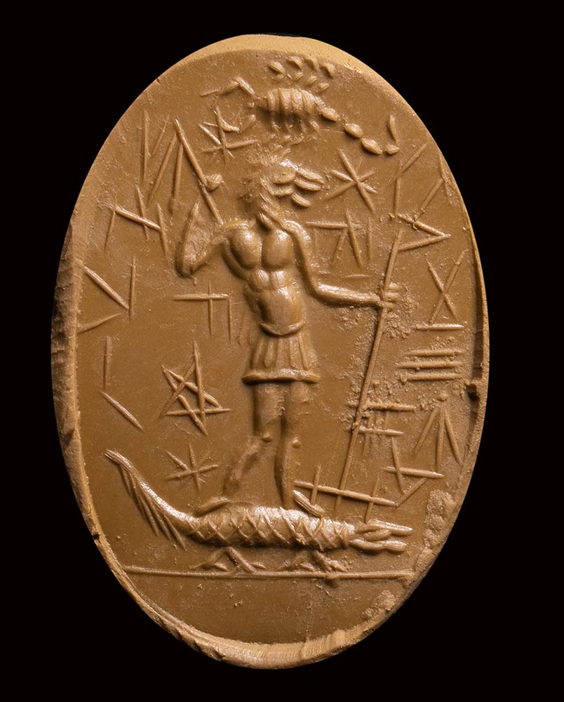 The scene depicts the jackal-headed Anubis in armour, standing to left on a crocodile; also to left. Both arms raised and bent in elbow, the left hand holding a whip, right hand a trident. Above Anubis, two eight-pointed stars and a scorpion. Around the figure and in the free field: letters and charakteres including a pentagram and a star. Groundline. Slight chips on the edge of the stone. Traces of deposit inside the engravings. Parallel: The Campbell Bonner Magical gems database, CBd-2575