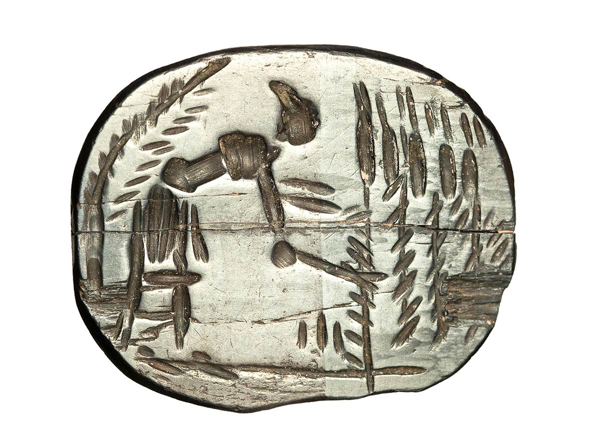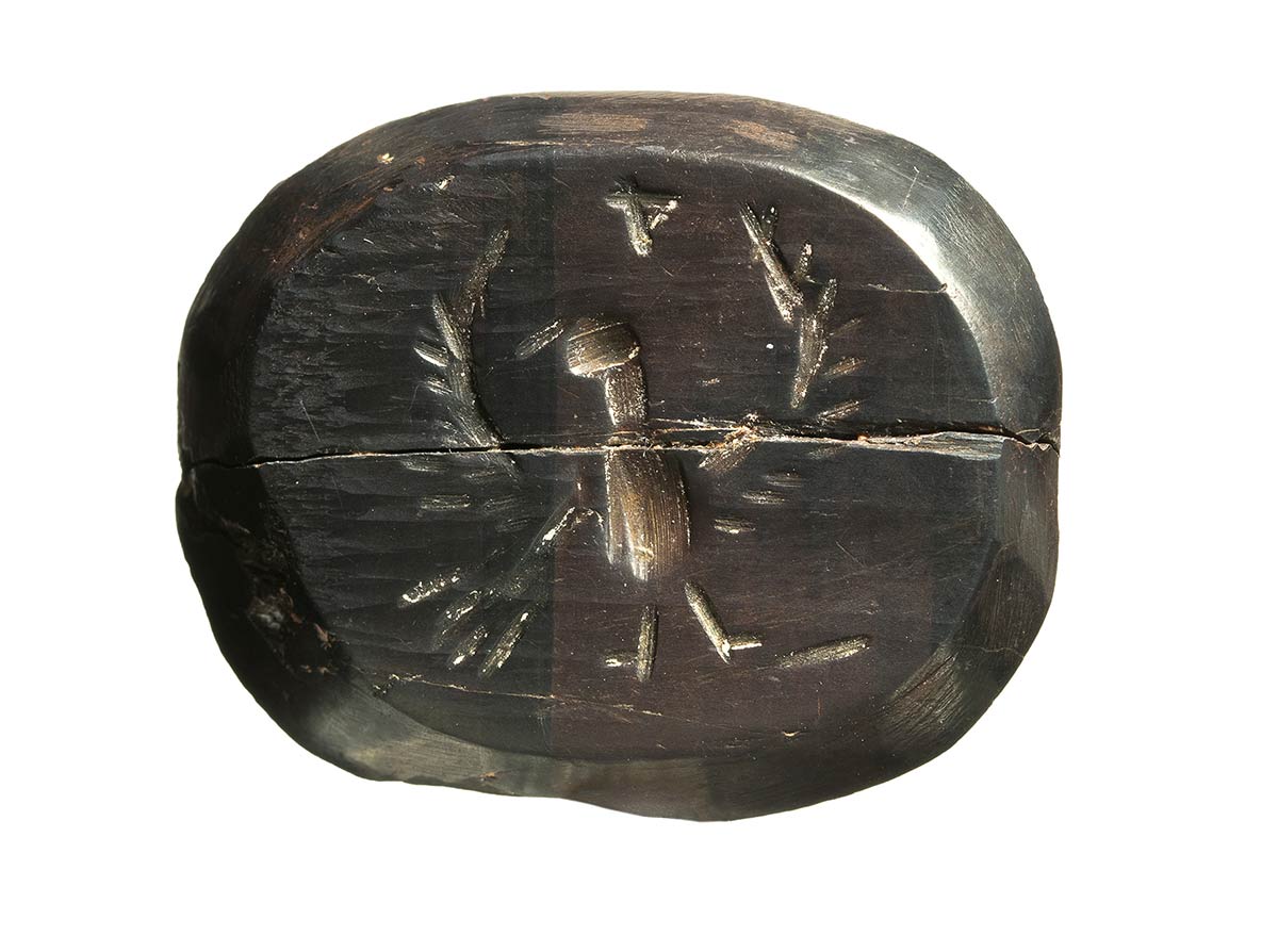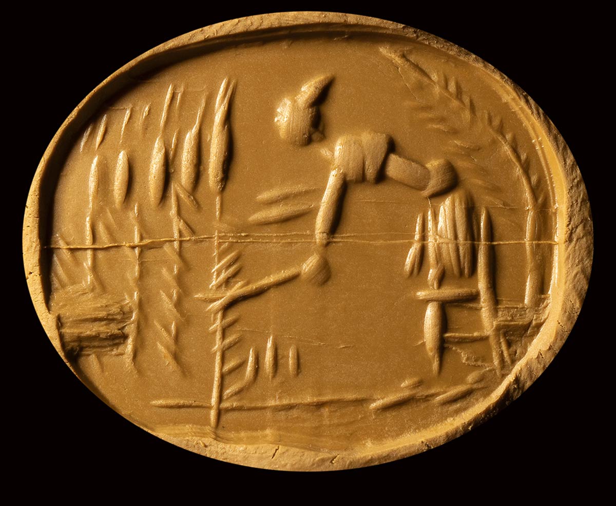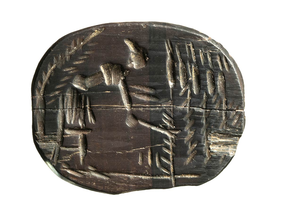 Longitudinal crack visible on the stone (stone is broken in 2 pieces). A series of hematite intaglios show a reaper leaning forward to cut tall stalks of wheat with his sickle; behind him rises a tree branch. On most of them, we found inscriptions on the reverse, indicating they are amulets against hip pain. This lies in the fact that this type of work presupposes that one does not suffer from the hips. Hematite was a stone appreciated for its ease in breaking, because hematite dust was frequently used in medicine. The breaks of hematite gems can testify to a medical rite in which a part of the stone was pulverized to make a medicine.