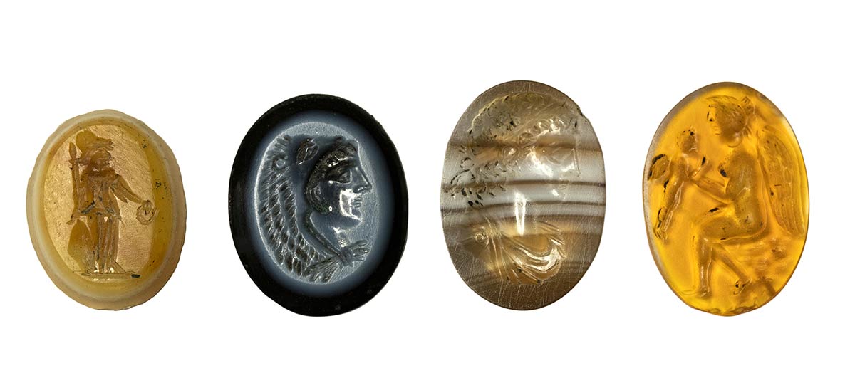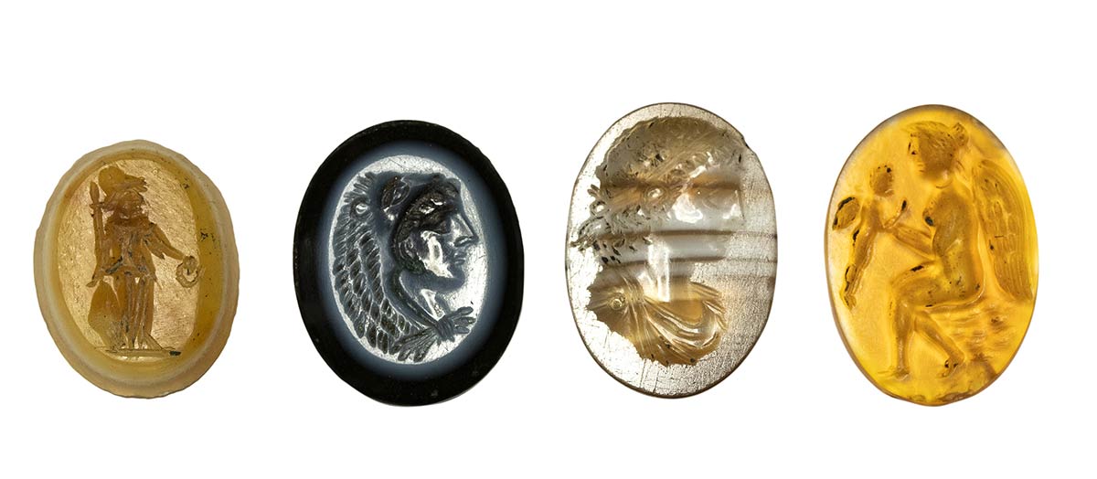 From left to right: A three-layered agate helmeted Minerva standing, turned right. A nicolo intaglio with portrait of Hercules turned right and wearing the lion skin. A banded agate intaglio with the bust of an hellenistic ruler turned right.