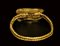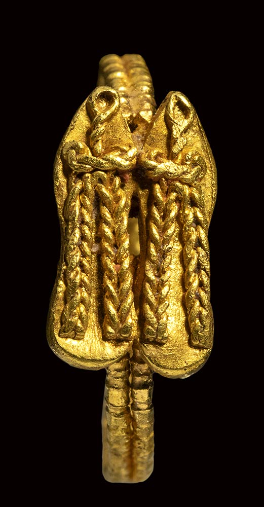 Hoop composed of two trick beaded rods soldered side by side. The table modeled as two sandals with plaided laces. Gold sandals were found in the tub of the three foreign rives of Pharaoh Thutmosis III.