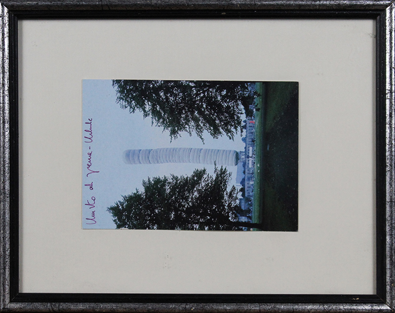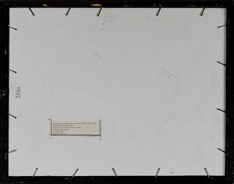 CHRISTO AND JEANNE-CLAUDE, "5,600 Cubic Meter Package, Kassel", 1968, Photo, Dim. 16x12, Descrizione foto: Empaquetage de 5.600 mètres cubes, Kassel 85m hight, 10 m diameter, Al verso: etichetta con descrizione, Al fronte: firmata in alto al centro, Opera con cornice