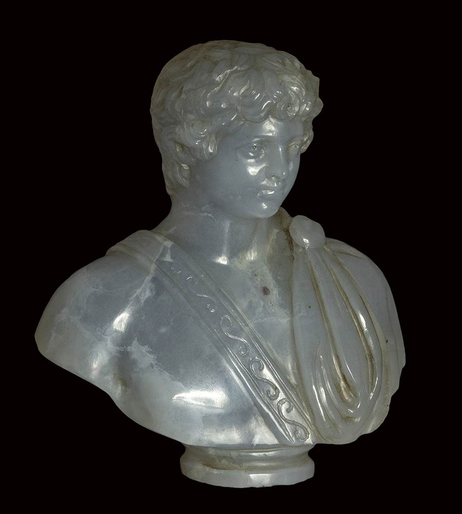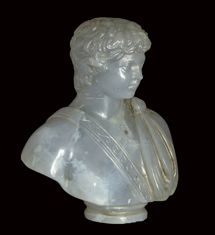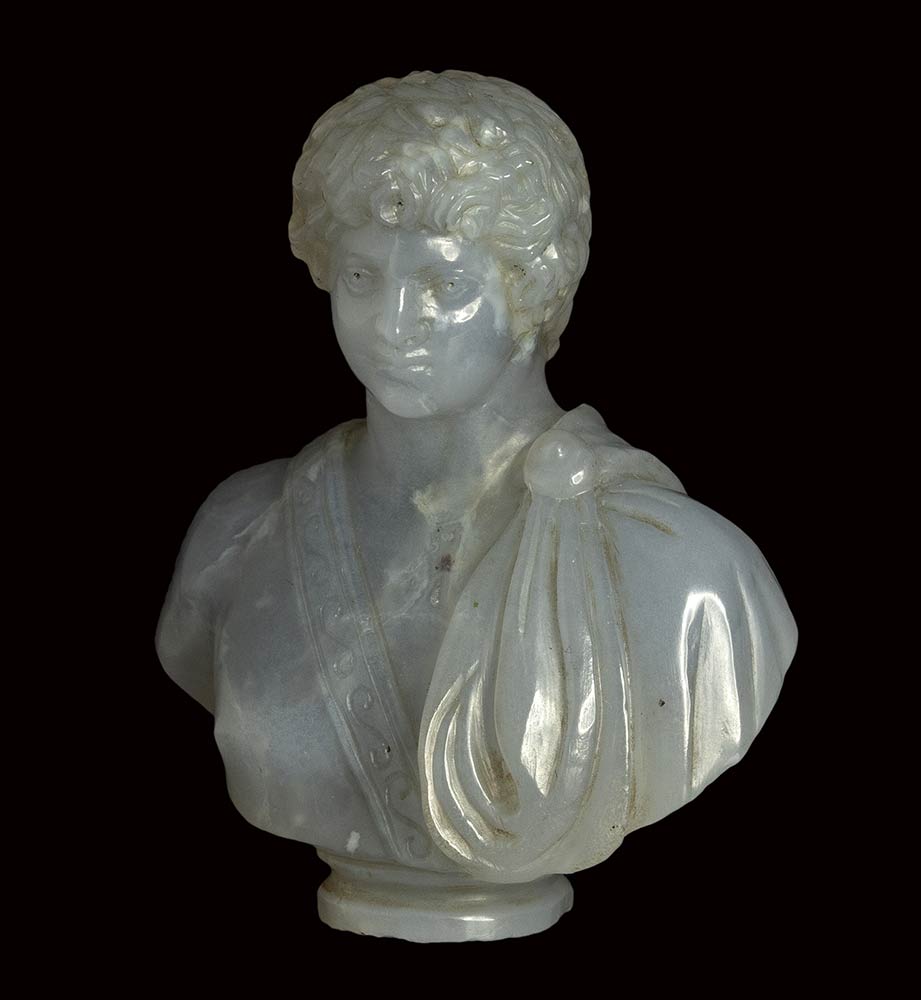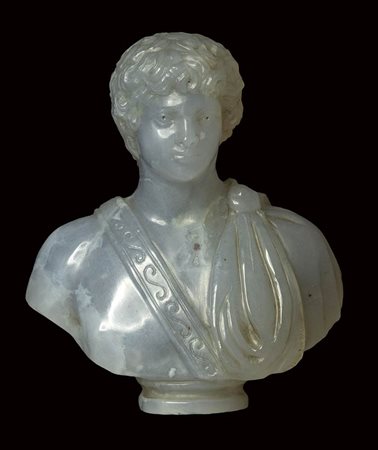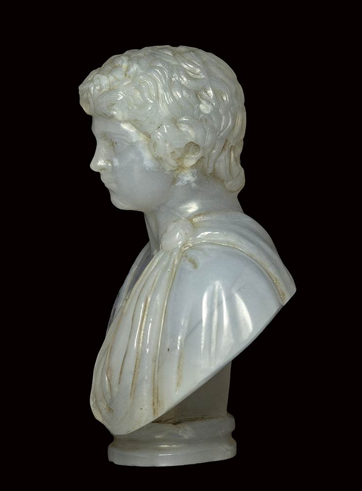 Bust of Caracalla as a child, of the type created in 198 A.D. for the designation as Augustus. This bluish chalcedony bust is inspired after the white marble (198–204 A.D.) from the Vestals' House at the Roman Forum (early 3rd century A.D., National Roman Museum Baths of Diocletian). The model can be identified not only for the typical features of the young Caracalla, but also for the peculiar shoulder belt, with S-shaped motifs (parazonium), and the cloak with chlamys, resting on his shoulder. After the antique. Probably made during the Grand Tour Era. Very good condition. Old deposits. Slight wear marks.