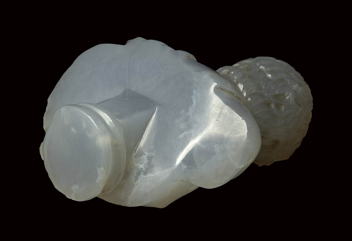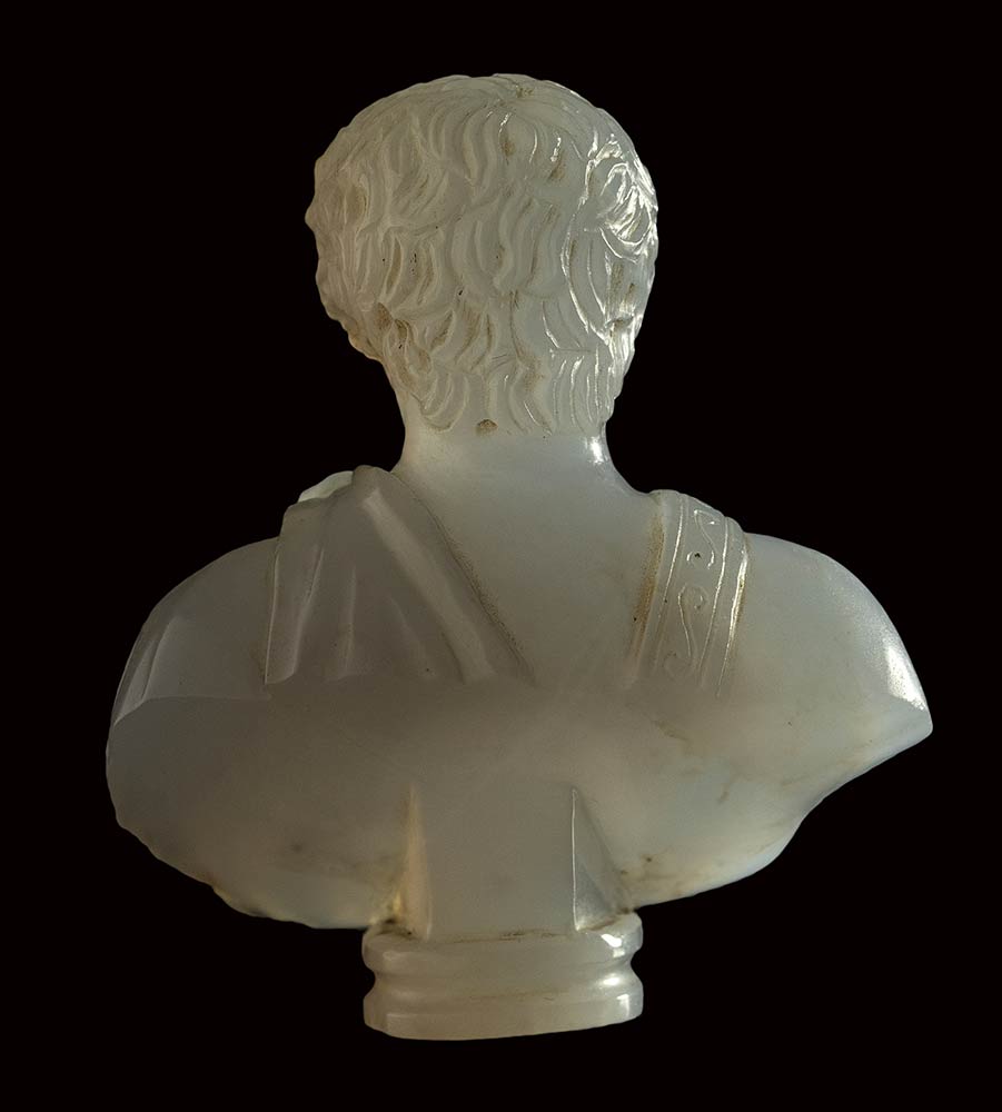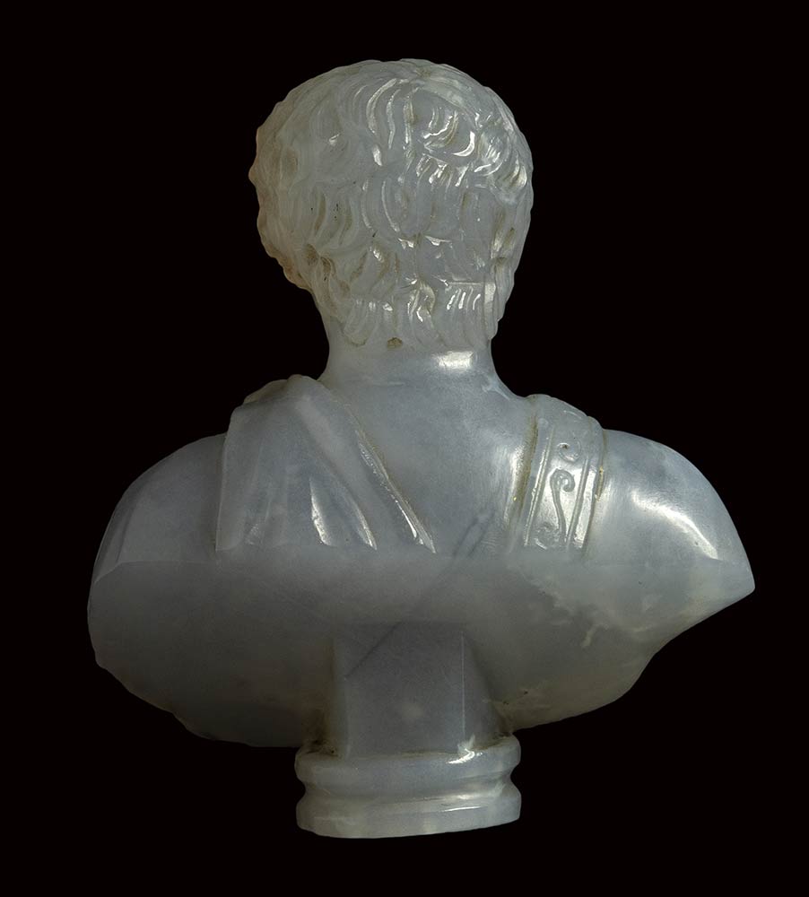 Bust of Caracalla as a child, of the type created in 198 A.D. for the designation as Augustus. This bluish chalcedony bust is inspired after the white marble (198–204 A.D.) from the Vestals' House at the Roman Forum (early 3rd century A.D., National Roman Museum Baths of Diocletian). The model can be identified not only for the typical features of the young Caracalla, but also for the peculiar shoulder belt, with S-shaped motifs (parazonium), and the cloak with chlamys, resting on his shoulder. After the antique. Probably made during the Grand Tour Era. Very good condition. Old deposits. Slight wear marks.