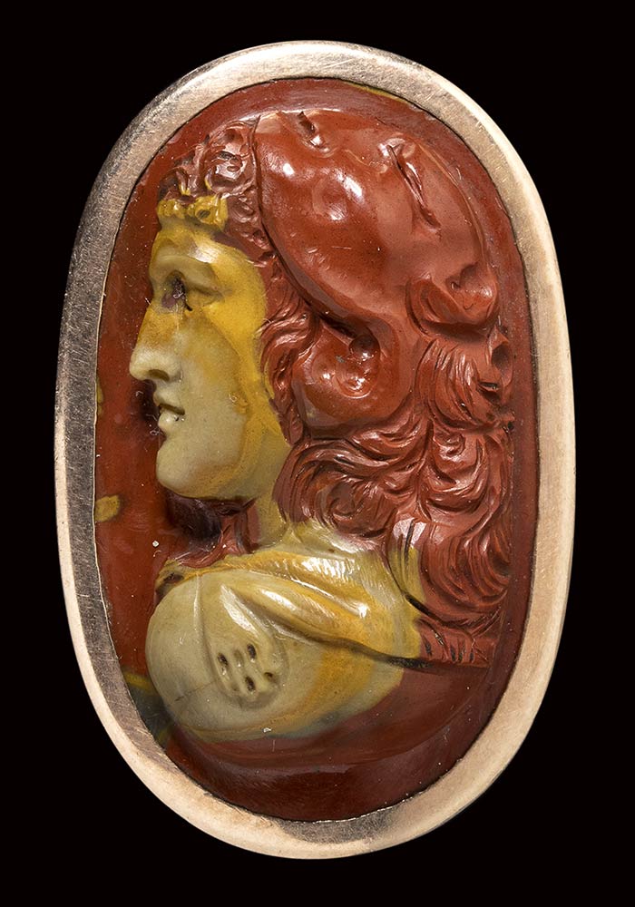 The hero is depicted with the head in profile and the shoulder seen from behind, slightly in three-quarter. The head is covered by the leontea, which goes down to the back; the paw rests on his shoulder. The profile is marked, beardless. Exceptional use of the two colors of the stone; the yellow part is used strictly for the face, neck and shoulder of Hercules; his hair and the leontea are red. The cameo is mounted in a gold frame.