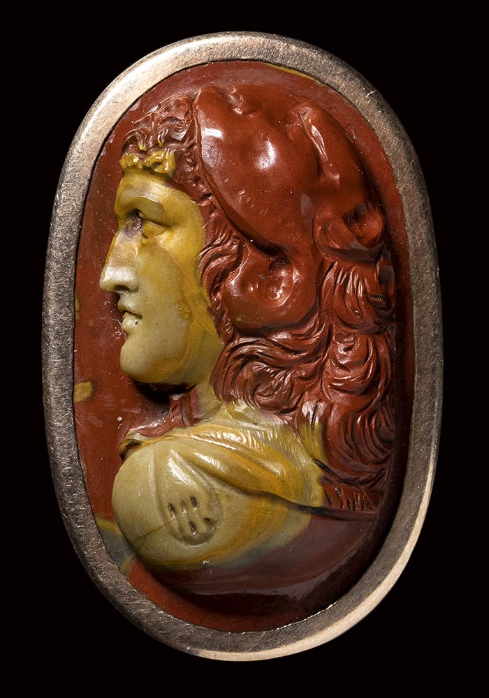 A fine bicolor jasper cameo set in a gold frame. Bust of Hercules. <br><br>18th - 19th century.
