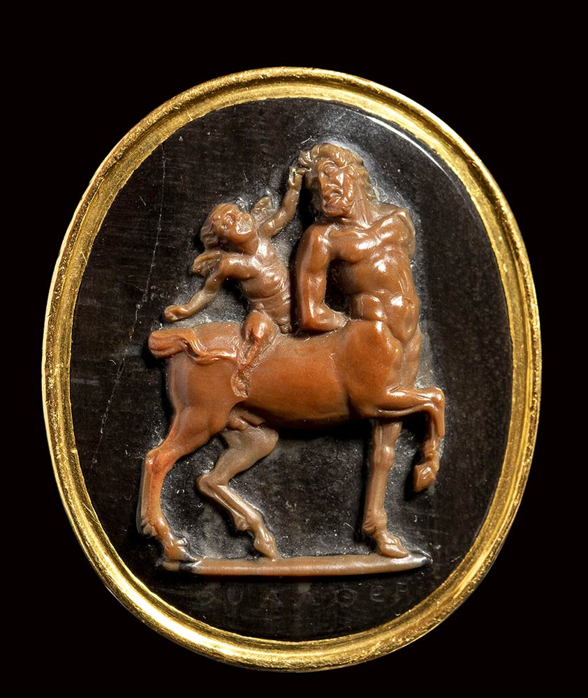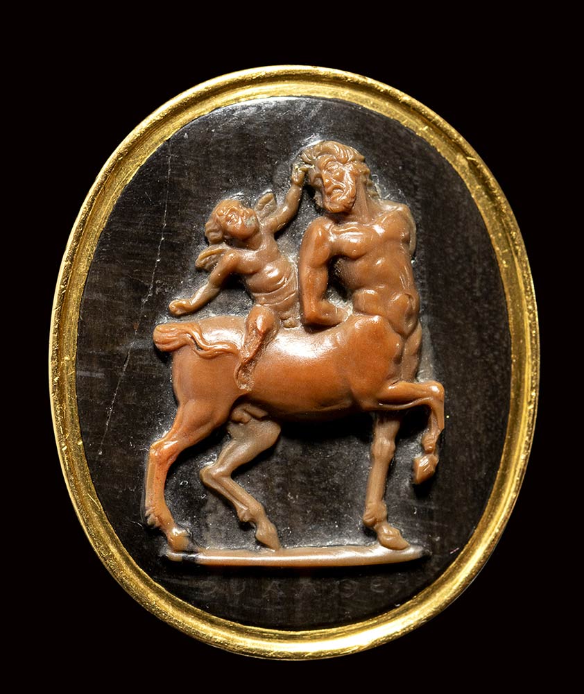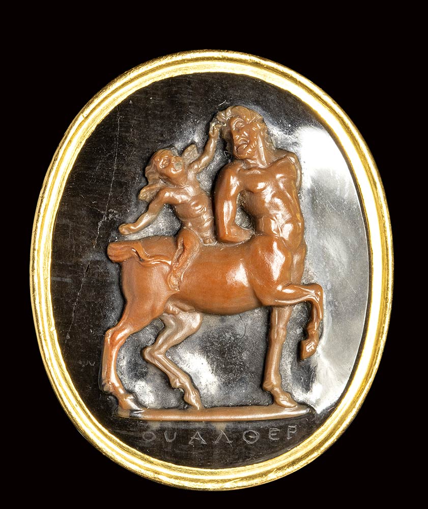 An important signed agate cameo set in a gold ring. Centaur with Cupid. 18th century.