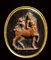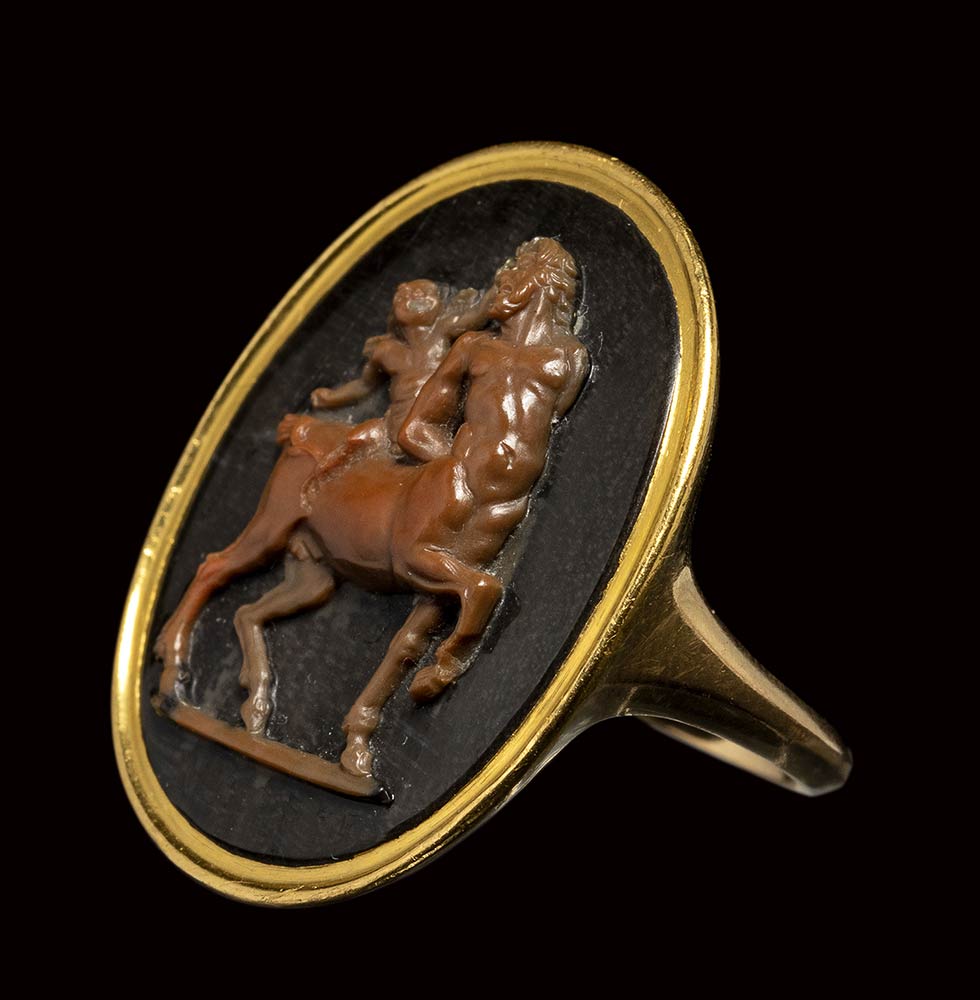 This large hardstone cameo of the Centaur with Cupid (Allegory of the invincible strength of the Love) is engraved by Ludwig Friederich Walther (1757-1817), with his signature in Greek. The stone is mounted in a Georgian gold ring, c. 1780. Missing on the figure and a crack in the stone. This cameo can be identified as a gem which was commissioned by «the equerry von Crailsheim», i.e. the baron Alexander Hannibal von Crailsheim (c. 1740-1816), chamberlain at the Brandenburg-Ansbach court, personal master of the stable of the duke, and which he had set a ring, which became before 1793 the personal ring of an important member of the Hohenzollen family, Christian Friederich Karl Alexander (1736-1806), last margrave of Beyreuth and Ansbach. The margrave was a well-known amateur of horses and of love. About the career of the gem engraver Walther, the centaur cameo is one of his few gems attested in contemporary literature, documented by 1793 as one of his masterpiece. It seems that the material used for this gem is a rare type of fossilized wood, found from 1767 onwards in Rodach - north of Coburg- and exploited by the Walther family until it was exhausted in the late 18th century, became a stone, comparable to an agate. The motif of Centaur with Cupid is copied from a 2nd century A.D. (Hadrianic) marble statue (from Borghese coll. than to Louvre coll. in Paris). This subject was engraved twice by Giovanni Pichler, the last one carved before 1782.