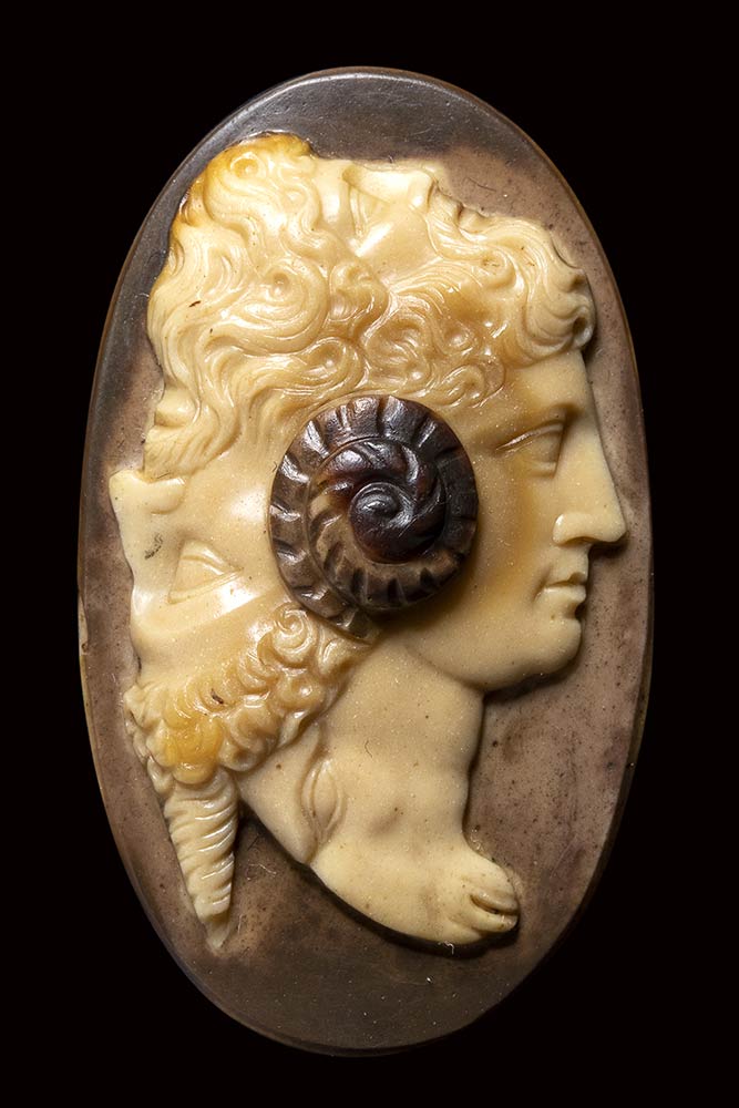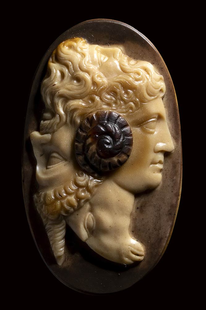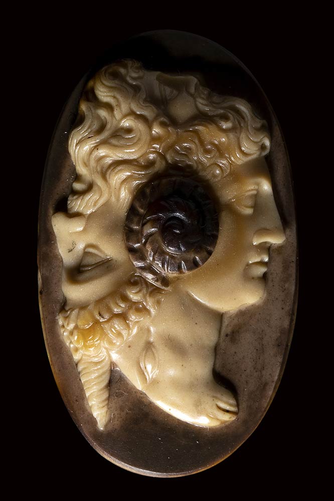 The hybrid creature is engraved on a three-layered agate, and is composed of: a youthful male face, a bearded male face, to which another bearded face is conjoined with a pointed horn (Poseidon?); to the three human heads is added a ram's head, whose horns are carved in the darker brown layer. Apotropaic iconography, inspired by roman and renaissance models. Beautiful execution.