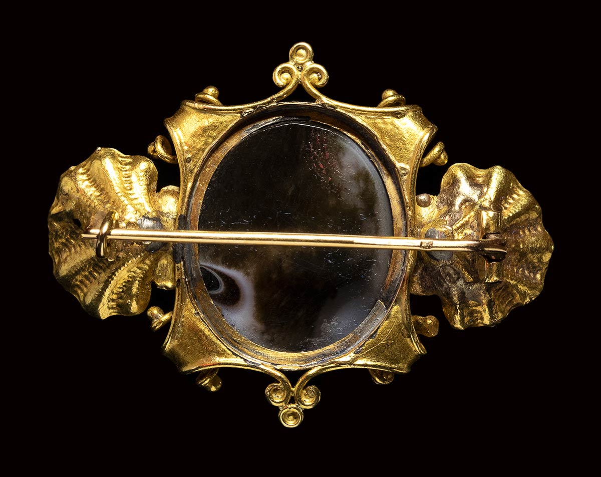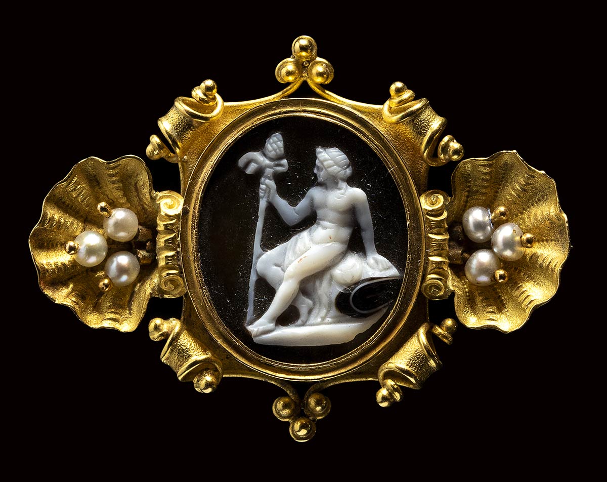 The god is facing left, seated and holding a thyrsus with his right hand. Sardonyx cameo set in a french 18ct gold brooch, c. 1850s (“hibou” hallmark), set with natural pearls. The pearls might symbolize Aphrodite. Very good condition.