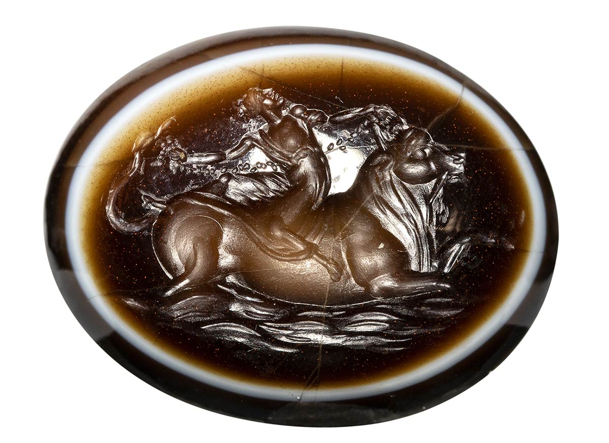 A fine neoclassical bull's eye agate intaglio. The abduction of Europa.