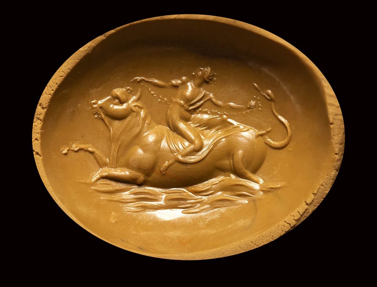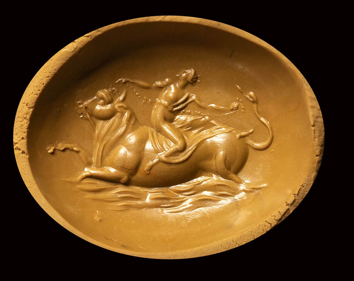 The scene depicts the famous mythical episode in which Zeus in the guise of a bull kidnaps Europa, crossing the sea waves. Intaglio engraved with great technical skill, considering the convex surface of the stone. Very thin internal crack. Close to the Berini's manner.