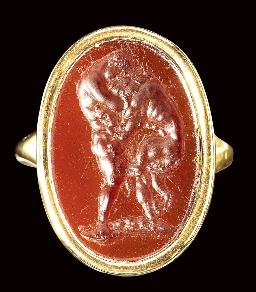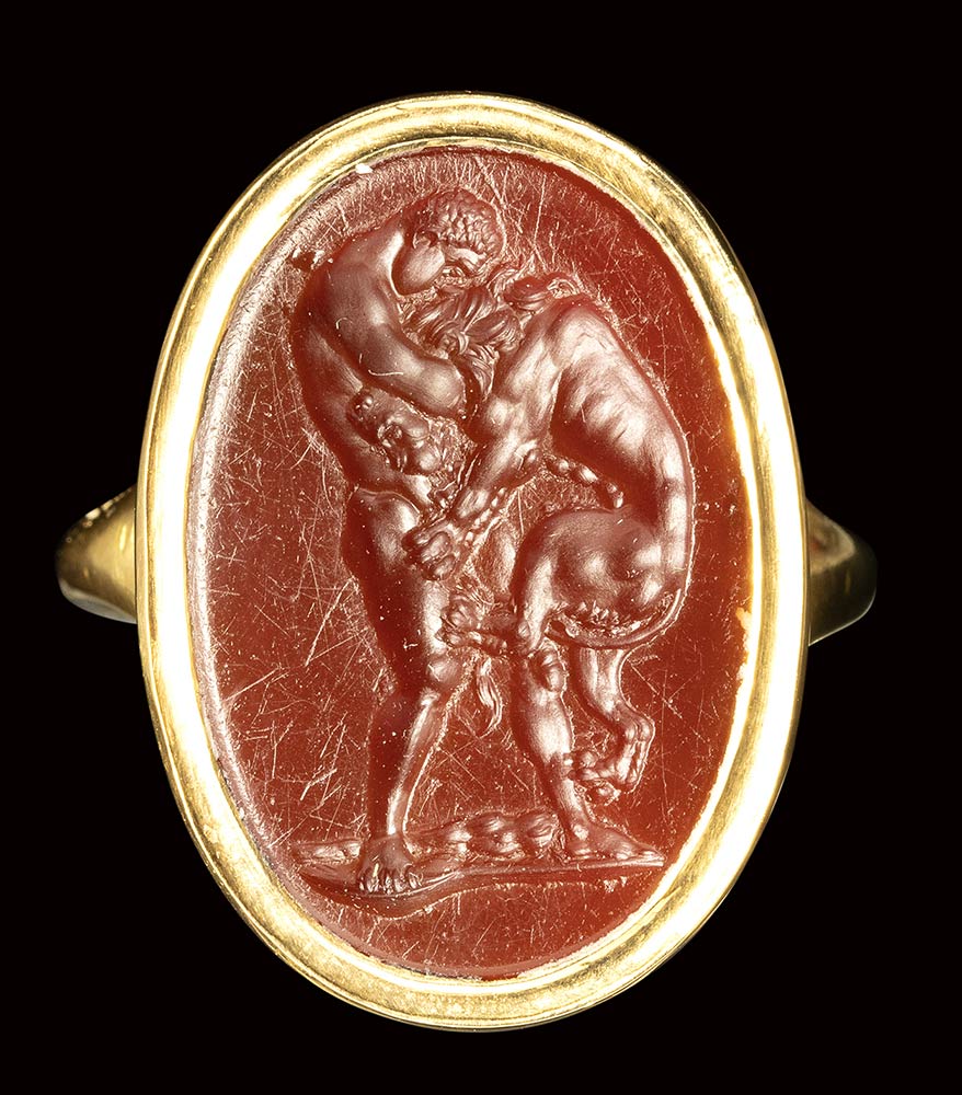 A fine neoclassical carnelian intaglio set in a modern gold ring. Hercules fighting the Nemean Lion. Late 18th - early 19th century.