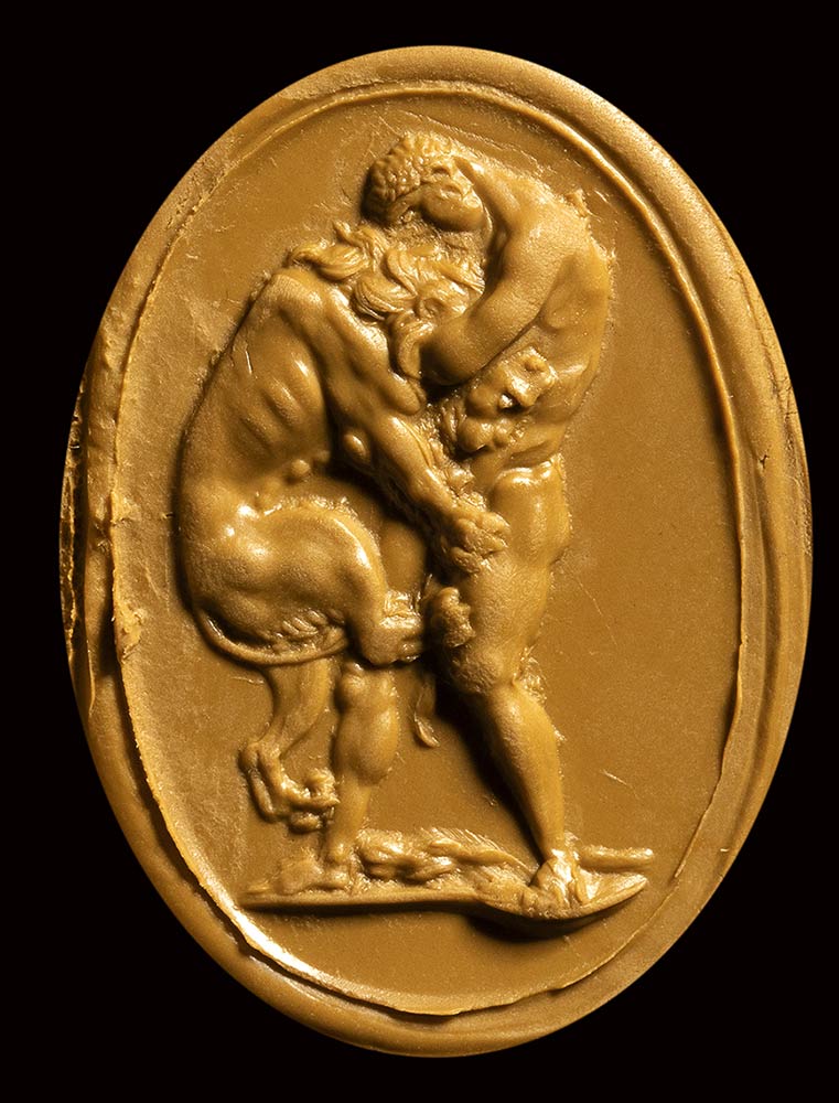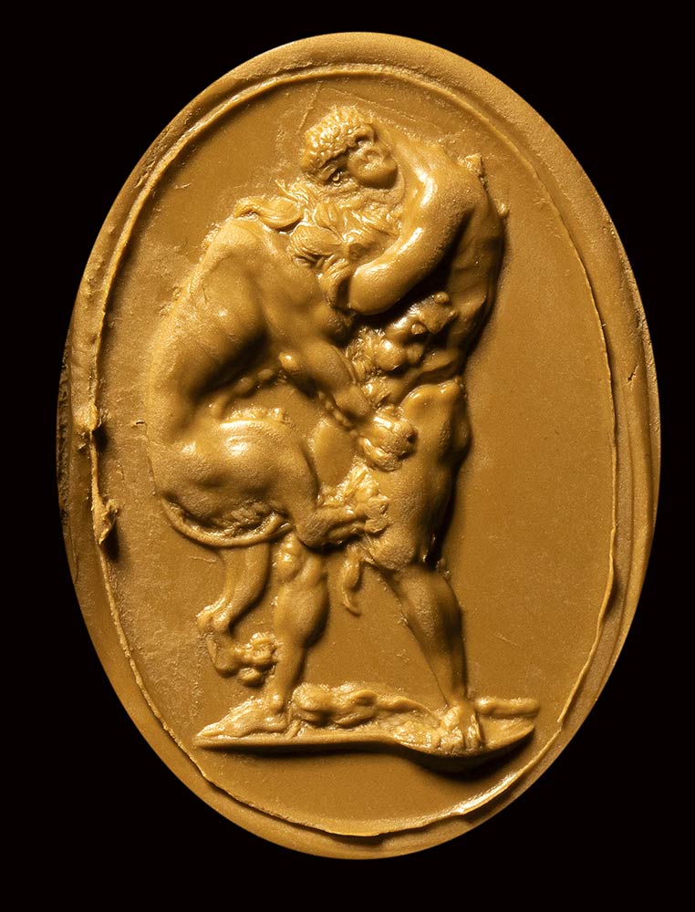 The hero strangles the Nemean lion. His muscles are tense for the effort. The beast clings to Hercules, but its defeat is very close. Below, the club. Groundline formed by a ground portion. The work is performed with great skill and particular attention to the anatomical details deeply engraved. The model is certainly ancient, but this intaglio is to be considered neoclassical, close to the production of Pichler and Calandrelli. Both engravers in fact, produced intaglios with this exact depiction, after an ancient intaglio in nicolo, formerly in the Jenkins collection, then Poniatowski (print engraved by Thomas Worlidge, 1757, London British Museum, Dep. Prints and Drawings n. 1859.0709.889 A Pichler’s intaglio with the same subject (onyx, before 1787) is defined by sources as “from an ancient gem”; that Pichler’s work is signed Filemonos in Greek letters, as a pseudonym and “forgery” for the Grand Tour market. Calandrelli engraved the same subject, with minimal variations.