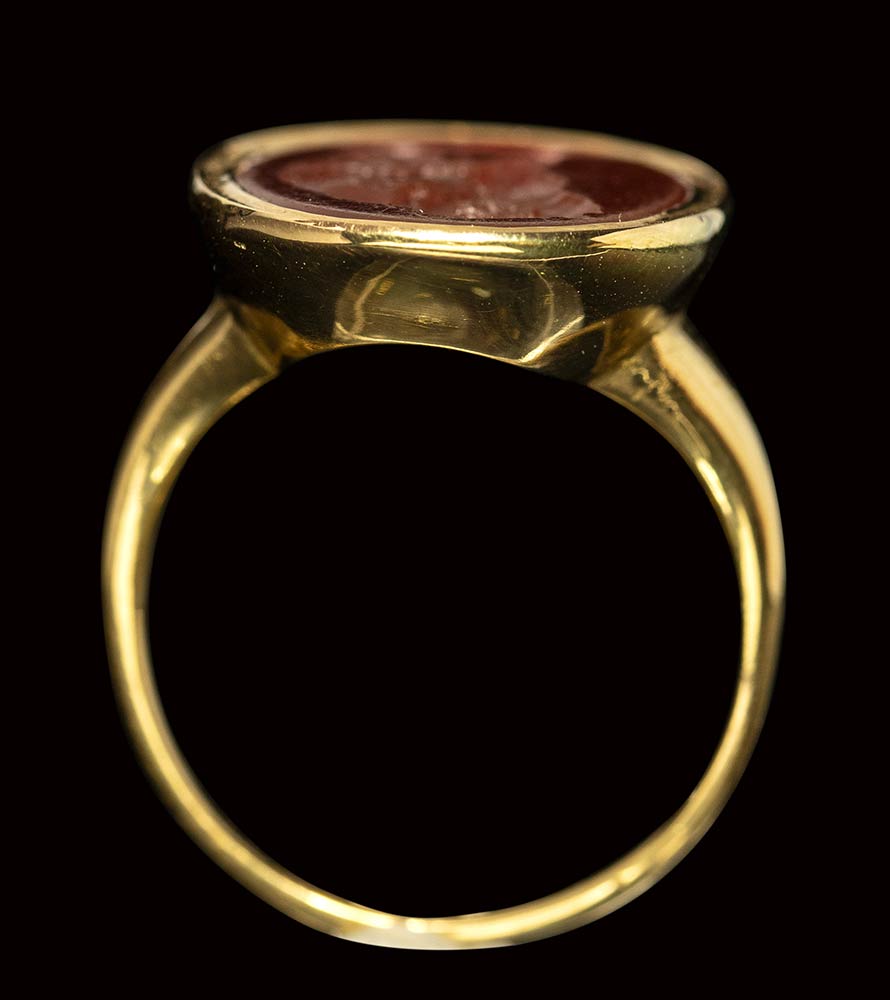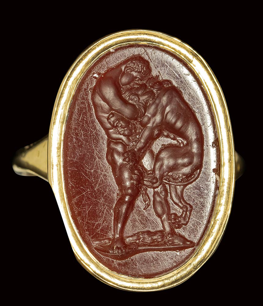 A fine neoclassical carnelian intaglio set in a modern gold ring. Hercules fighting the Nemean Lion.