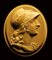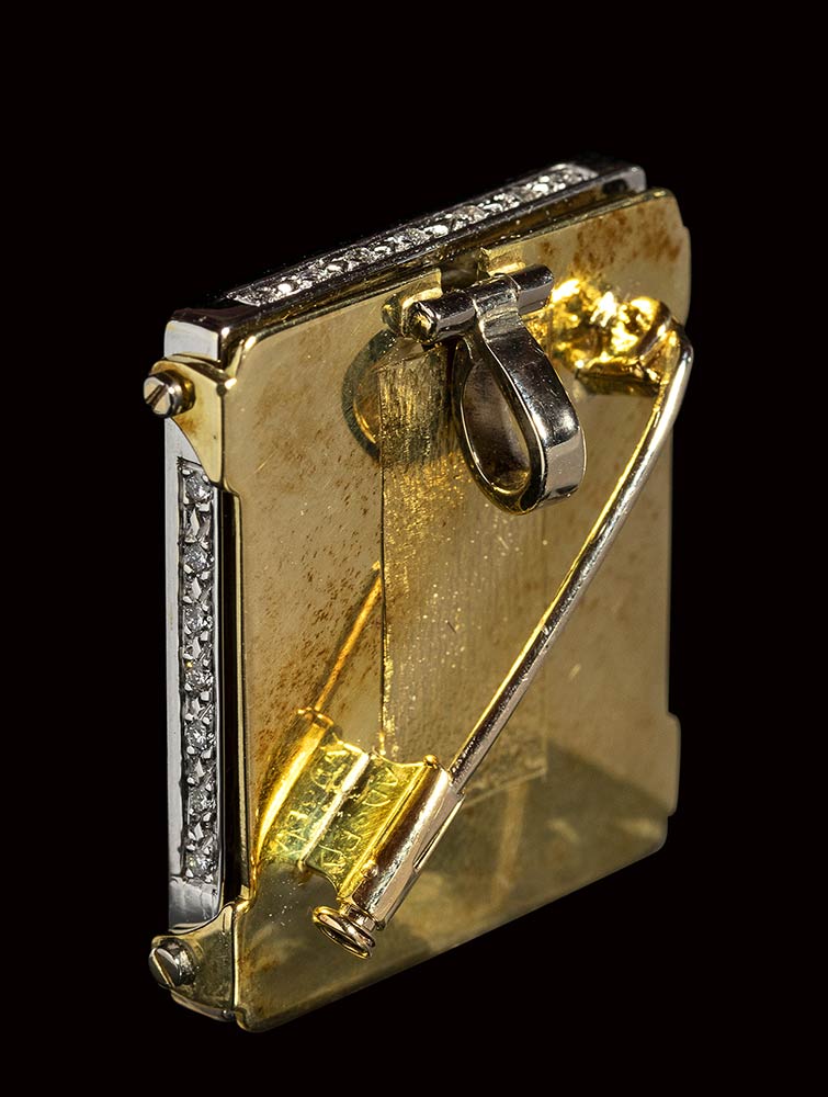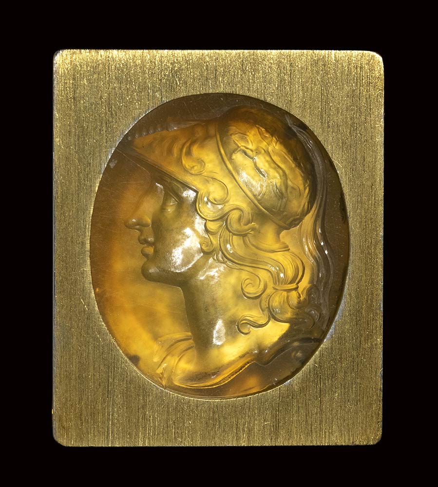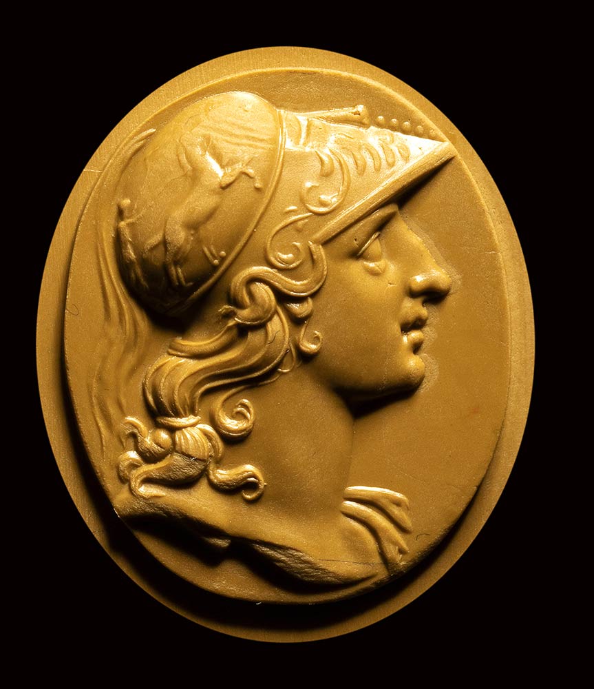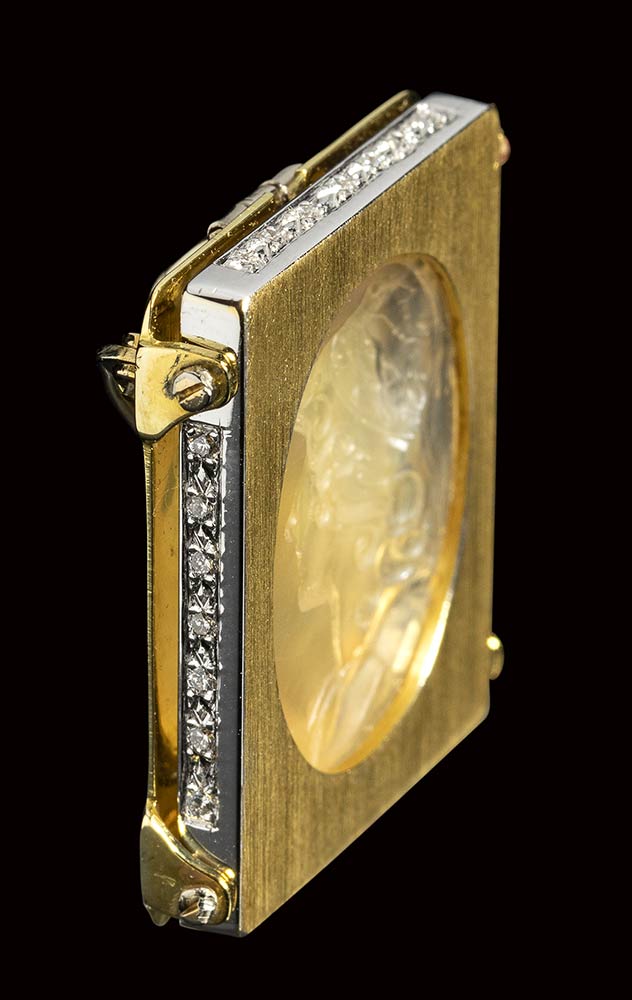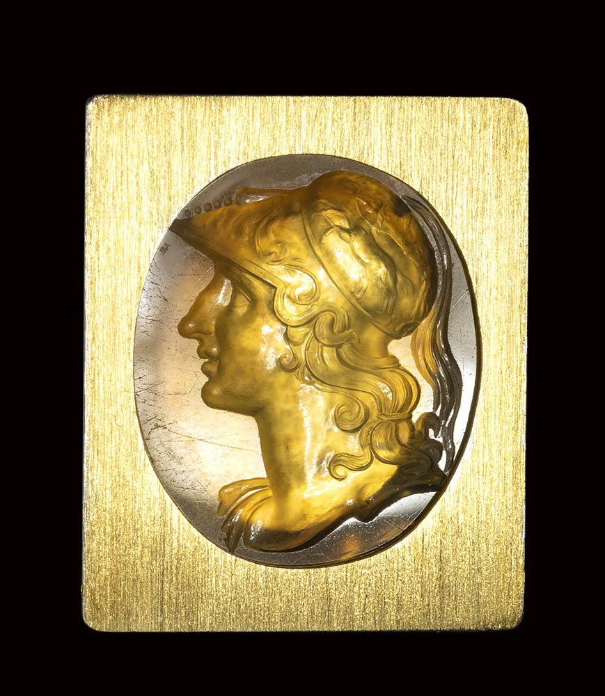 Head of Minerva, in profile to the left, with a finely decorated helmet with a dragon and a mask on the visor. The hair falling to the shoulder, engraved with great art. The profile is characterized by a slightly open mouth, inspired by hellenistic models. The gem is set in a contemporary gold jewel with diamonds. An almost identical intaglio, both in style and in subject, is in Florence, Palazzo Pitti (Museo degli Argenti), from the Collezioni Granducali. Probably these two gems were engraved by the same engraver. Le Gemme dei Medici al Museo degli Argenti. Cammei e Intagli nelle collezioni di Palazzo Pitti, p. 397, inv. Gemme del 1921 n. 217, GFSSPMF 297136 (Rock crystal intaglio set in a gold frame).