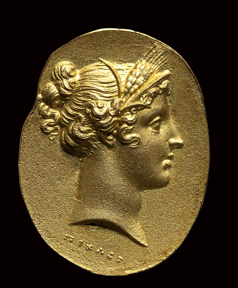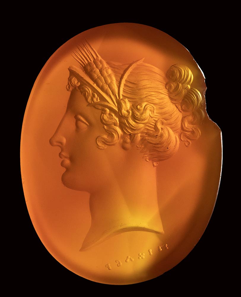 Head of Ceres, facing left, signed Pichler in greek. Chip with lack on the edge. The work can be attributed, as Paoletti refers for an almost identical intaglio, to Giuseppe Pichler: in the "Sessione 4, Opere di Giuseppe Pichler" in the Paoletti casts, there is a head of "Cerere Dea dell'Agricoltura", inv. MR 26760 n. 123 tomo V, with exactly the same head but with a draped bust (carnelian intaglio). Several others versions exist, all with variants. Giuseppe, alias Johann Joseph Pichler, was born in Rome in 1760. He was the son of the second wife of Antonio Pichler (1697-1779) and half-brother of the more famous Giovanni who initiated him into the family art. Very fine style. Parallel: L.P. B. Stefanelli, La Collezione Paoletti, vol. 2, p. 33 n. 123.