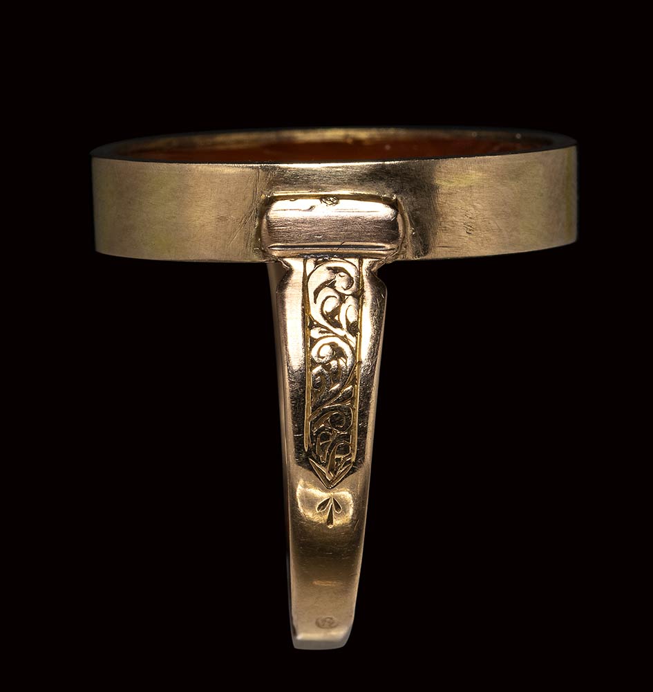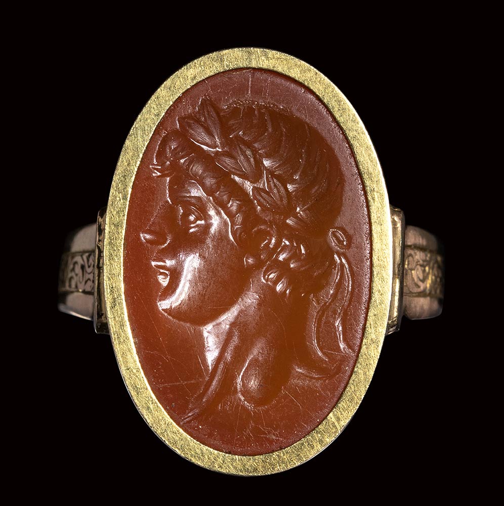 Lot 334 | A postclassical carnelian intaglio set in a gold ring. Portrait of an emperor. 18th century.
