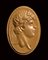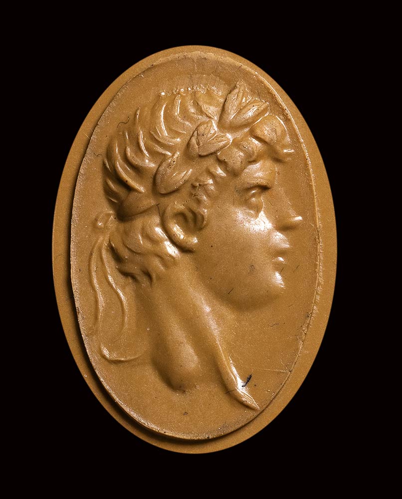 The intaglio shows the portrait of a young laureated emperor turned left. The features are soft with small rounded eye, a small aquiline nose and a semi-opened mouth. The rounded chin and cheek contrast with a muscular neck. The short forehead is surmounted by voluminous short hair framing the face and letting the ear uncovered. The laurel wreath is ending in the back with a knot and ribbons. Classical representation of a young roman emperor inspired by roman glyptics productions. The gold mounting with rounded hoop, chiseled foliages on the shoulders support and large oval gold box-setting (different gold ?). Gold mark.