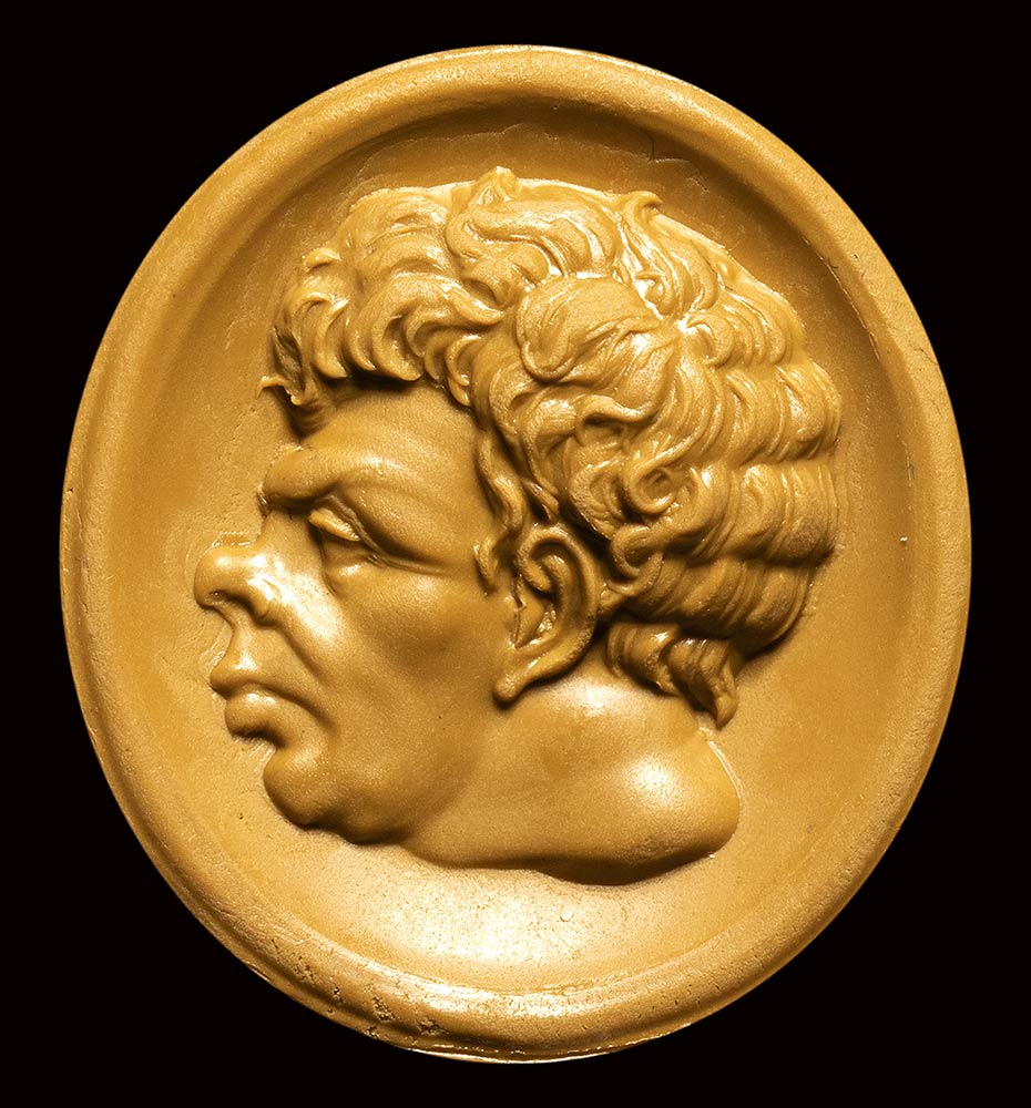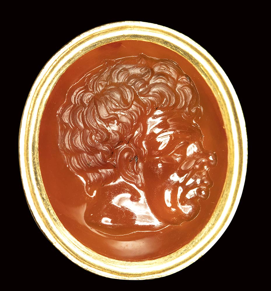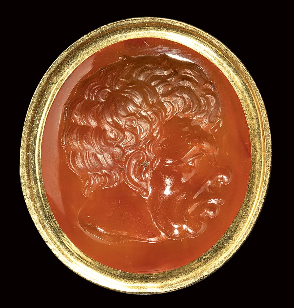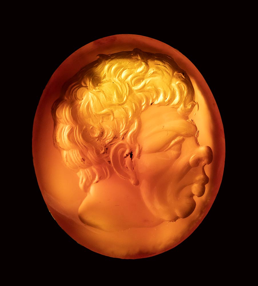 Male head facing right, characterized by realistic and almost grotesque features, perhaps a caricature. The typology of the portrait recurs with variations in the graphic production of Pier Leone Ghezzi, also known for his extraordinary caricatures. This gem is likely inspired by this mid-18th century repertoire. Fine style. Work expertly polished. Attractive deep red color of the stone, mounted as a seal. Very good condition.