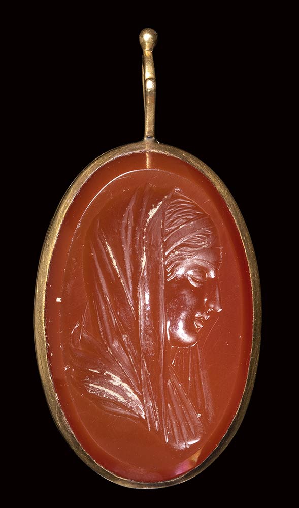 A neoclassical carnelian intaglio set in a gold devotional pendant. Madonna with emblema.