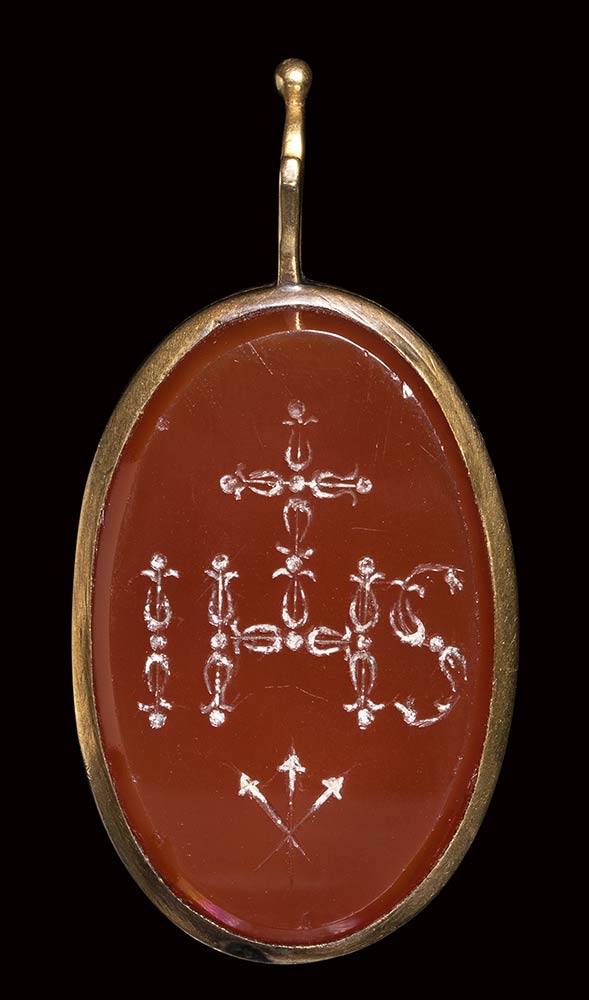 Bust of Madonna with veiled head, to the right. On the back of the gem: IHS surmounted by a cross; below three crossed arrows. The gem is mounted as a devotional pendant.