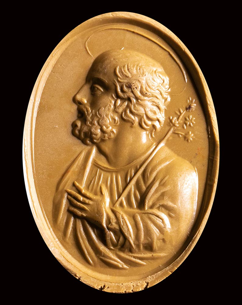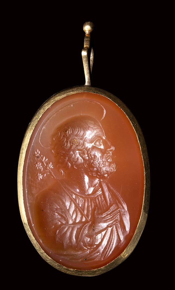 The character is draped, bearded and facing right. The arm holds a sprig of flowers and has an open hand. Halo over the head. St. Dominic of Guzman (?). Refined execution. The stone is mounted as a devotional pendant.