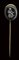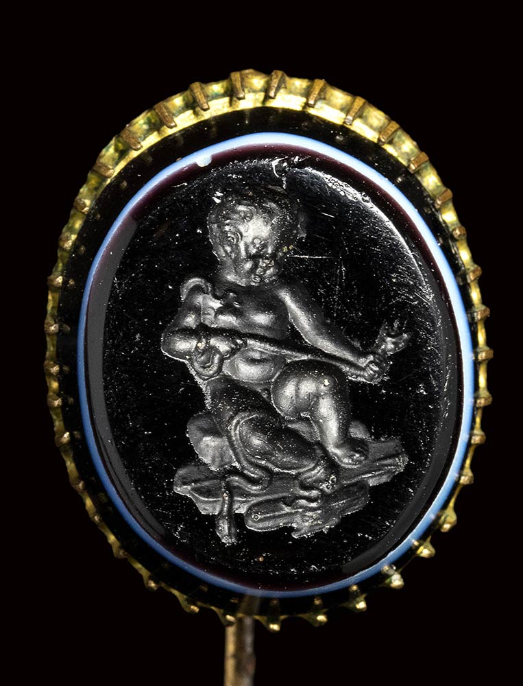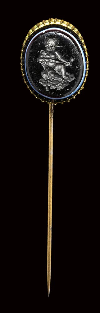 A dark glass paste impression set in a gold stick pin. Hercules as a child killing the snakes<br><br>19th century.