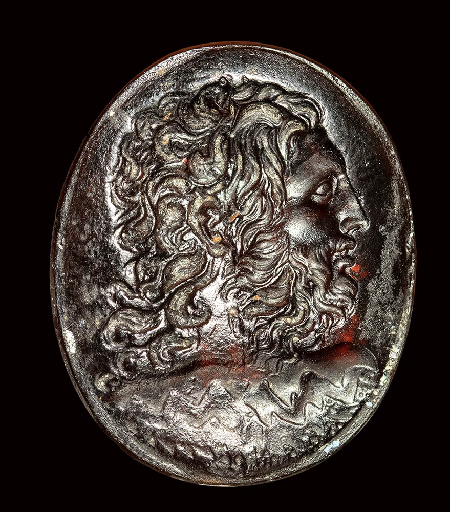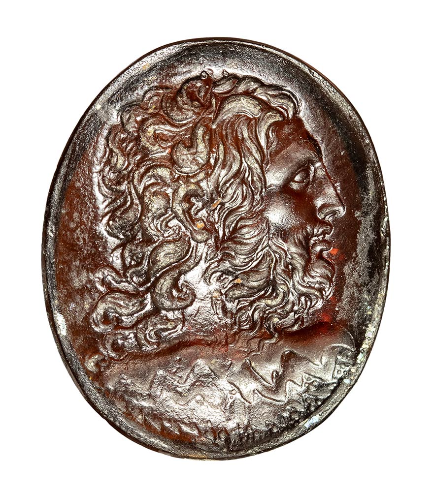 A large brownish glass impression. Bust of Okeanos. <br><br>18th - 19th century.