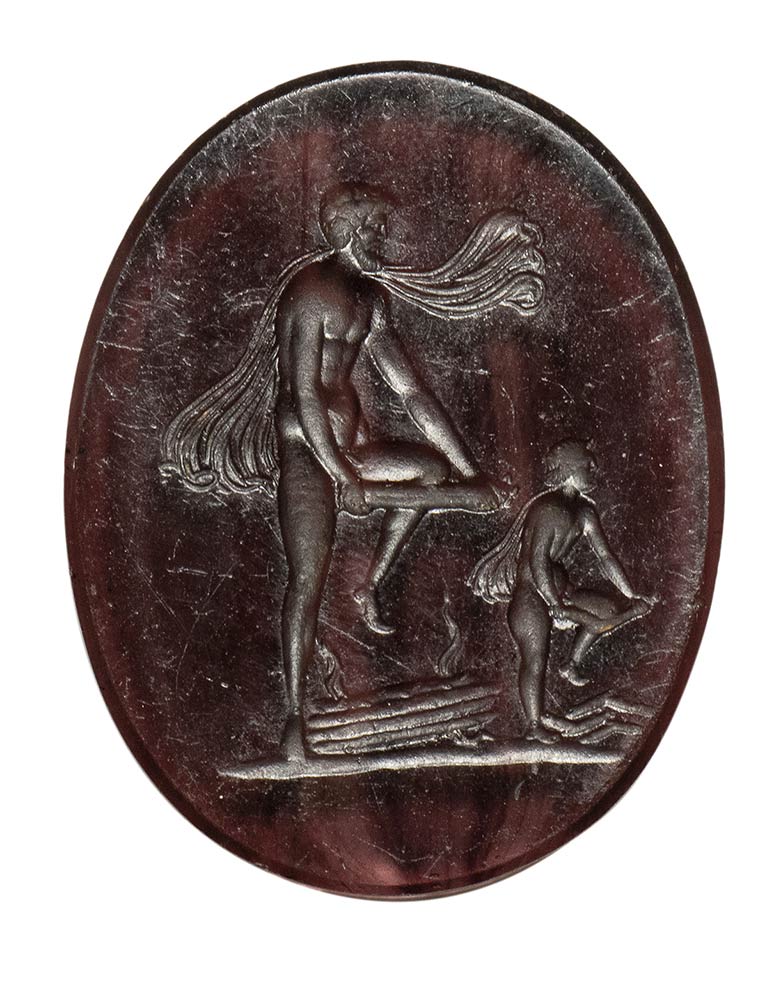 Unusual scene composed of two characters in the act of breaking a log of wood with their knees (?). One is an adult, bearded with a face similar to an Antonine emperor; the younger figure can be identified with Eros. They both have a cloak. Below, a pile of burning wood. Scene to be identified, probably allegorical. Grand Tour Era.