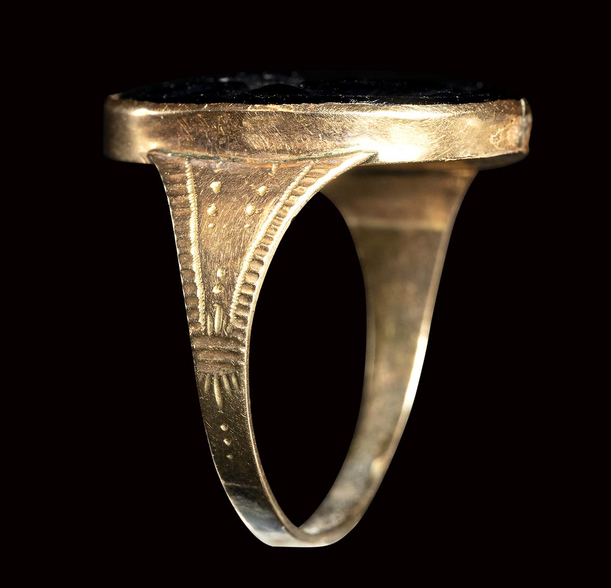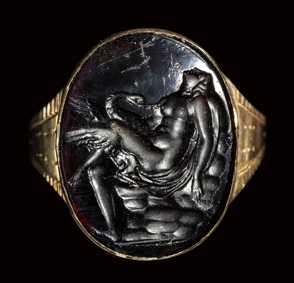 A dark glass Tassie impression set in a gold ring. Leda and the Swan.<br><br>18th - 19th century.
