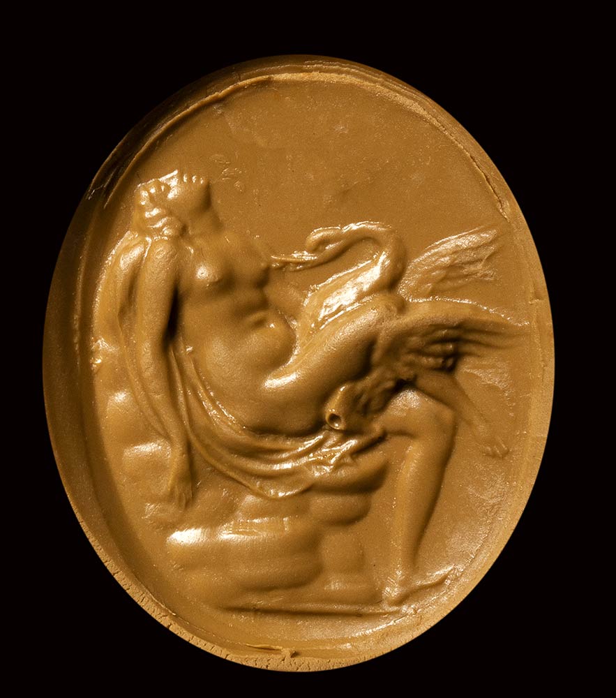 Leda, naked, seated on her dress and rocks, her head thrown back, embracing the Zeus swan. The original intaglio was executed by Giovanni Pichler (Rollet 1874, 34, n. 135). Slight wear marks. Parallel: J. Boardman, The Marlborough Gems, p. 284, cast n. 683 (17).