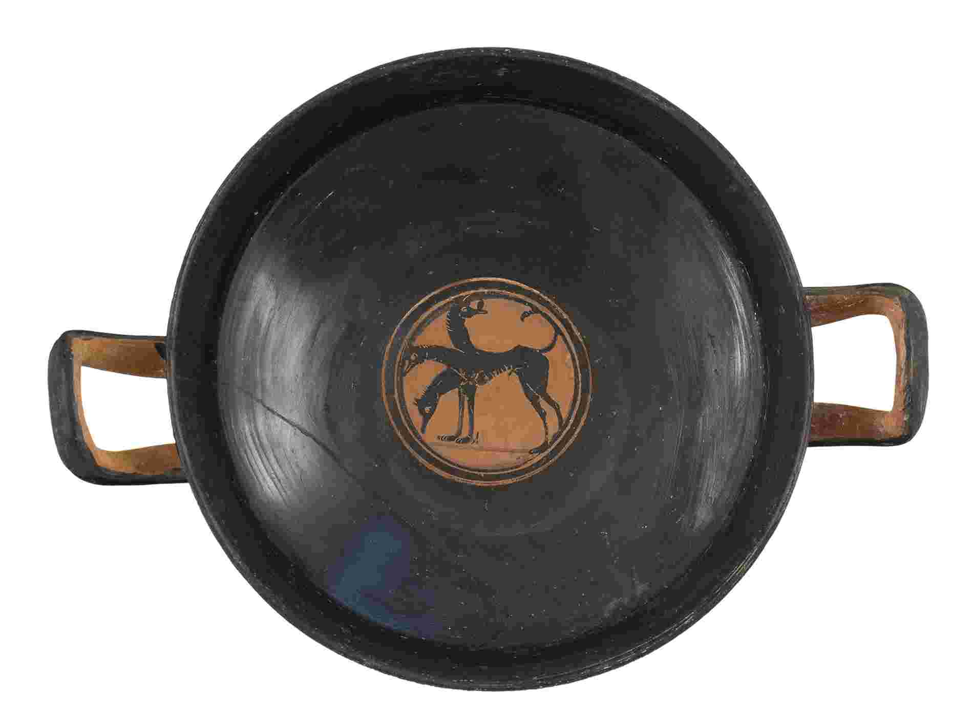 Black glazed body; on the central tondo Cerberus standing left, the multi-headed dog that guards the gates of the Underworld to prevent the dead from leaving.