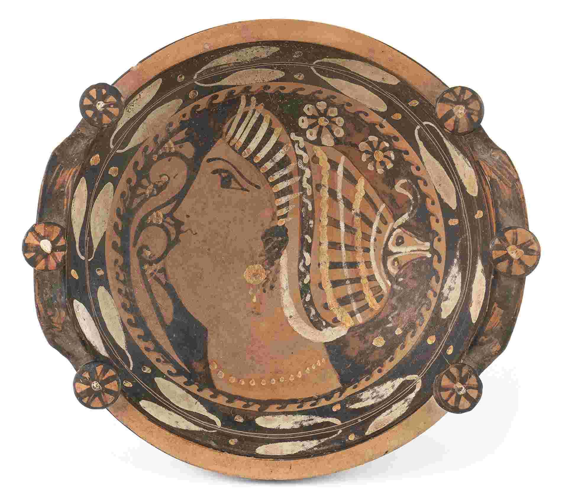 With double dotted handles; characterized by a female head in profile, with richly adorned saccos, radian stephane and jewellery.