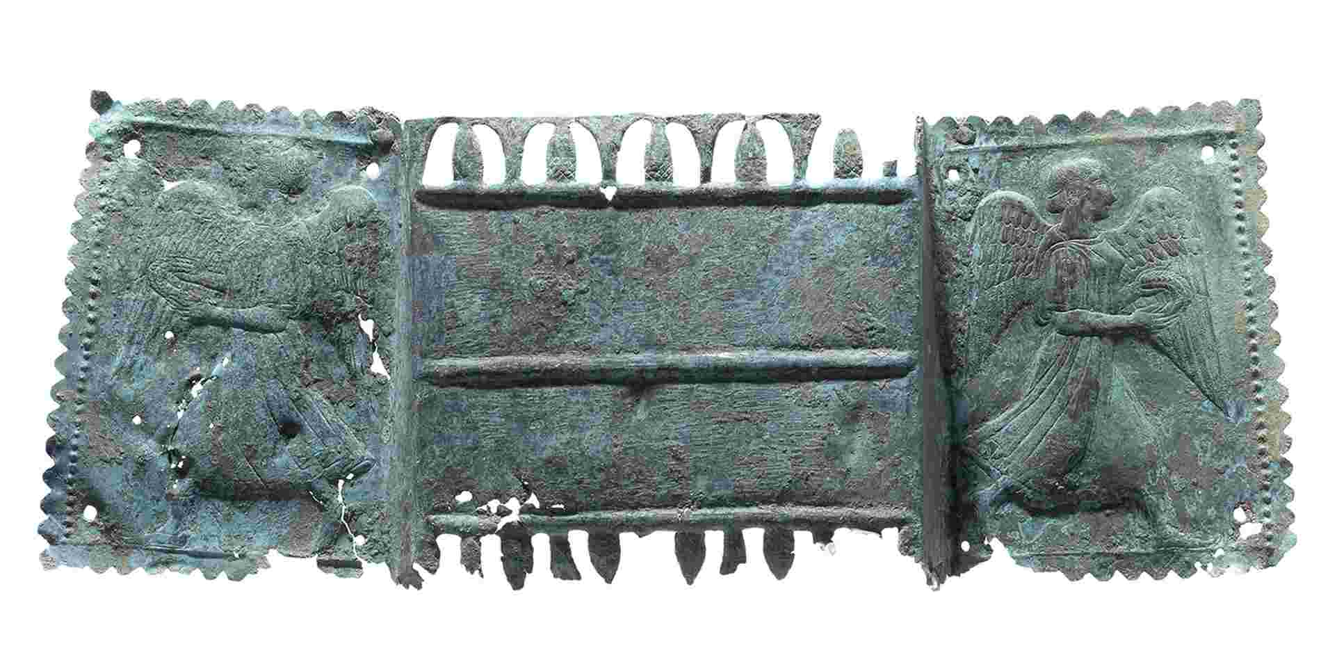 Part of a furniture, vehicle or door fitting. At both ends of the slab, is the specular figure of winged Lasa, with a chiton and pointy shoes, striding moving holding a wreath in her hands. Similar Etruscan bronze plaques, but from the Archaic period, also in the Edward Perry Warren collection in the Museum of Fine Arts in Boston (cf. Greek, Etruscan & Roman Bronzes in the Museum of Fine Arts, Boston 1971, no. 690).