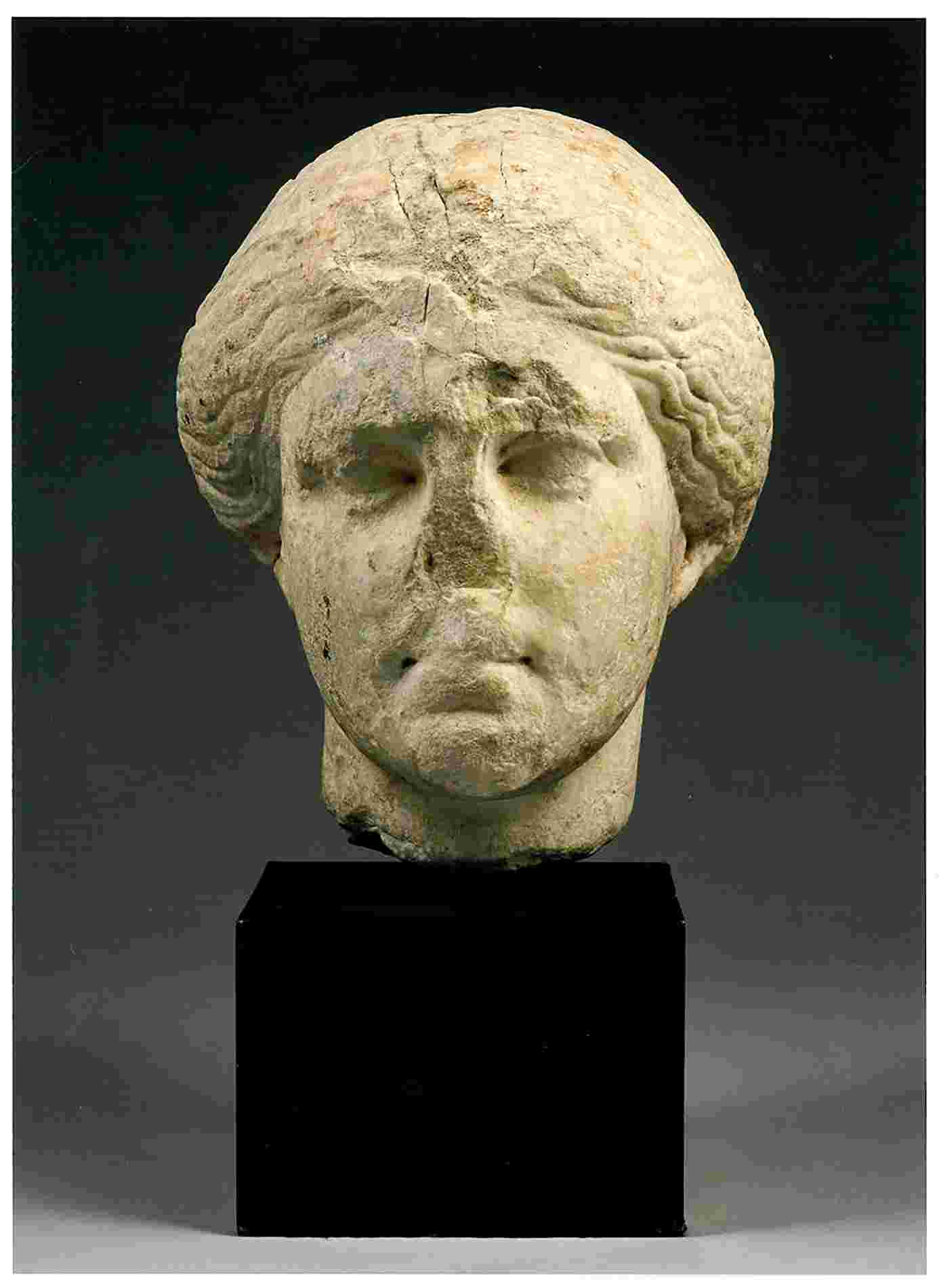 Larger than life-size Attic Pentelic marble female head, perhaps of a goddess. The oval is elongated, with full cheeks and round chin. Eyes and eyelids are delicately molded, creating the effect of a deep gaze and a feeble smile. The forehead is framed by fine and soft locks tied back, that allow us to glimpse the ears. The face is partially damaged by ancient injuries: an ancient restoration made on back and top of the head is still visible through the traces of the gradina tool (or tooth chisel) and the oxide of an iron pin. The state of preservation is impressive, similar to that of the Elgin Marbles. Provided with a museal stand.